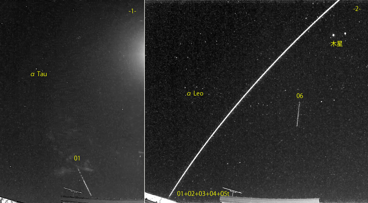 1) 17:31の1コマを、2) 22:50から約1時間の6コマを処理しました。 出現した順に数字と記号を始点付近に記入。tは痕traceあり。【流星群記号】Co:かみのけ座流星群。 22:50:58-22:51:02にかけて、低空から打ち上がるような長経路の流星が捉えられました。 音更町の知人の映像によると、消滅点はペルセウス座に達したようです。知人カメラでの消滅時刻:22:51:01。