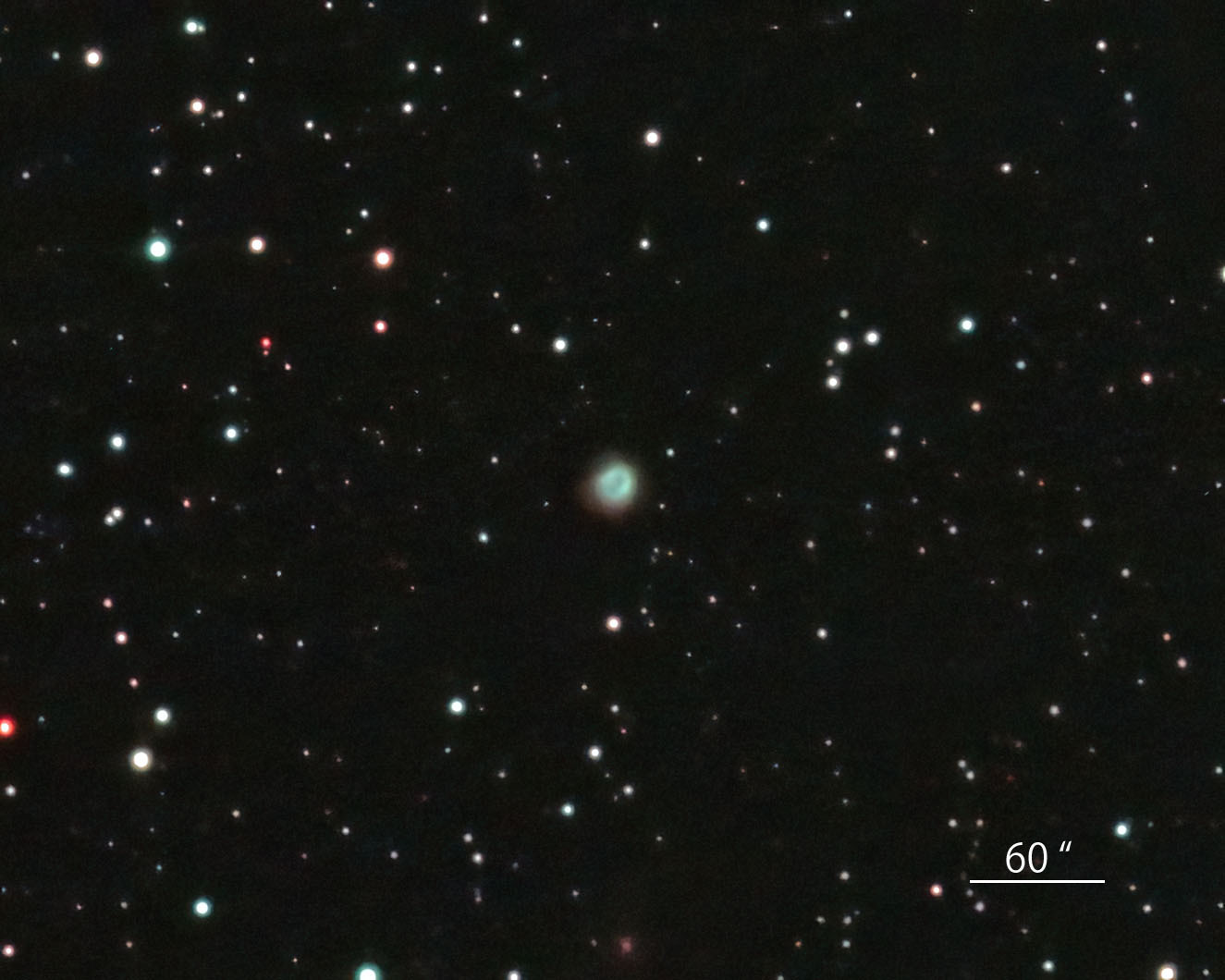 かなり南天に低い、とも座の小さな惑星状星雲です。楕円形の青いドーナツ状構造の外方にも不整形の淡いハロがあるようにみえます。南天方向は観測場所からはこの高度が限界です。