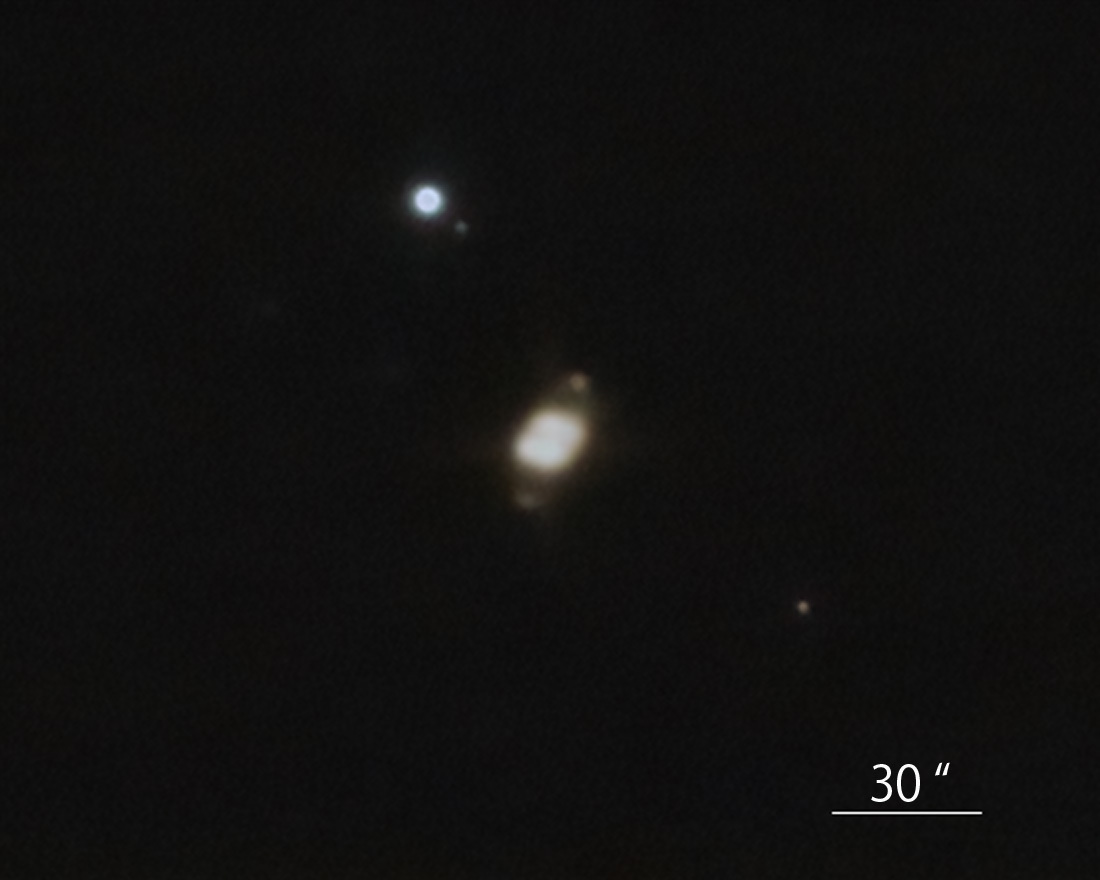 しし座にある小さな星雲ですが、惑星状星雲になる前段階で「protoplanetary nebula」とのこと。見えてはいませんが、中心星が「Frosty Leo」と呼ばれているそうです。雲出現のため二夜かけての撮影になりました。ハッブルの画像とは比較になりませんが、なんとなくそれらしい雰囲気はわかるかな・・・・という程度でした。中心部と両サイドとの輝度差が激しく、撮影・処理には再考の余地があります。