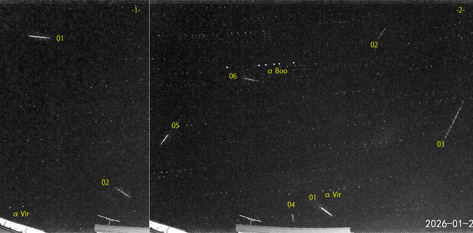 1) 01:08から約1.5時間の2コマを、2) 03:28から約2時間の6コマを処理しました。 出現した順に数字と記号を始点付近に記入。tは痕traceあり。【流星群記号】Co:かみのけ座流星群。 快晴となり、朝の最低気温はマイナス18℃。