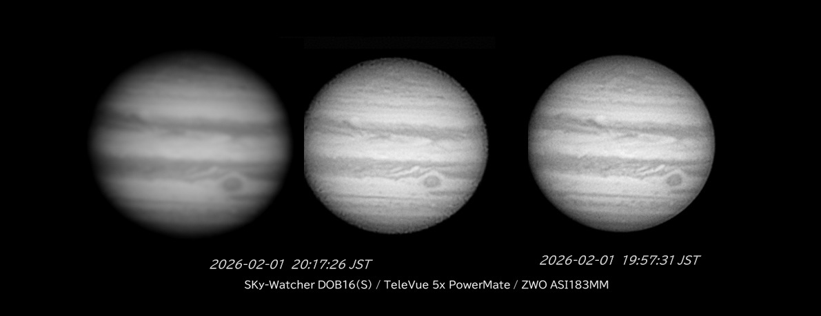 18時頃から落ち着いたイーイングで期待したのですが期待外れでした。動画ではそれなりに模様が見えるのに(左)、スタック数・露出速度に関係なく細部が復元されません。揺らぎが無く見た目は良さげでも、ジェット気流で微細な模様が潰れているのでしょうね。早い時間に高い高度で撮影できるのに残念な日ばかりです。