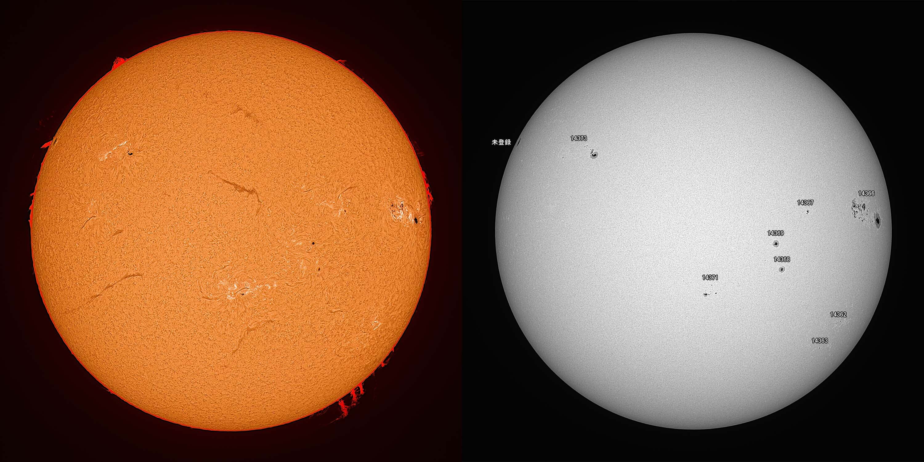 光球面:FireCapture、ROI 3600x2400、Gain 100、1.7msec x1000、撮影時間 31秒/プロミネンス:FireCapture、ROI 3600x2400、Gain 300、1.7msec x1000、撮影時間 31秒