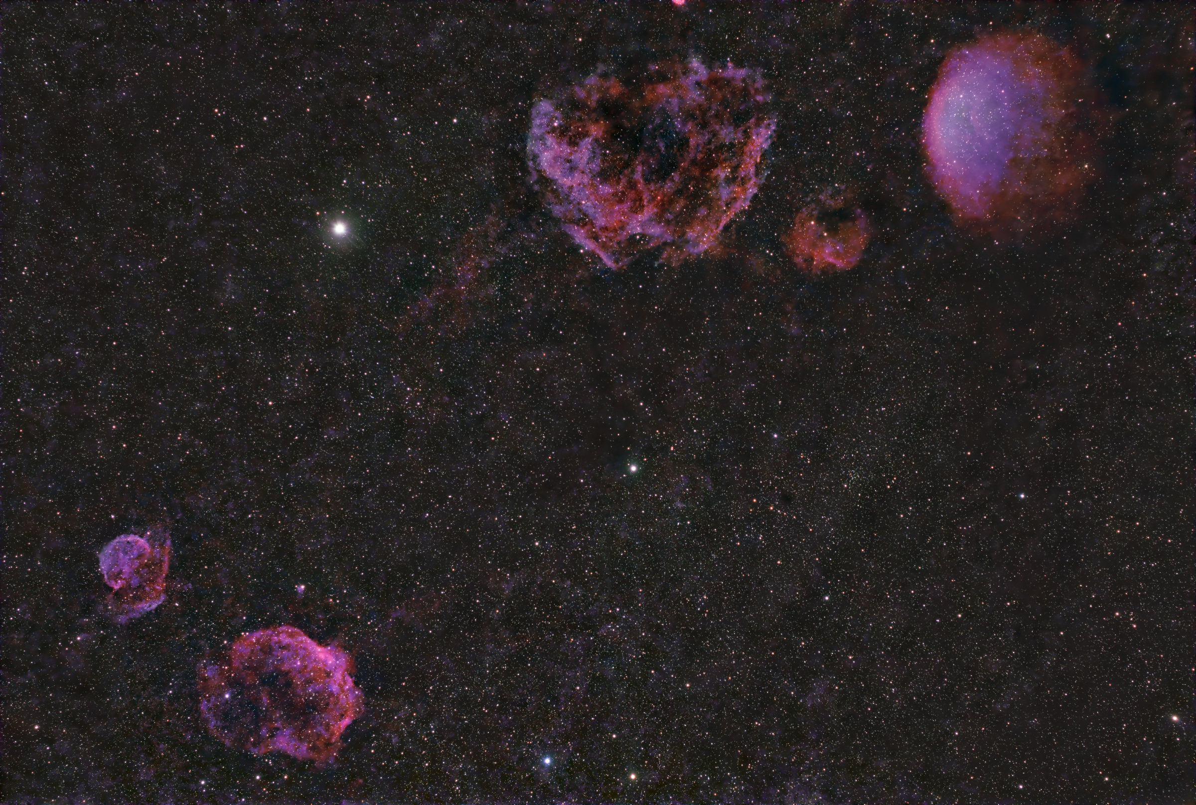 ぎょしゃ座カペラ周辺の超新星残骸や惑星状星雲のHII領域たちです。ナローバンドじゃないとなかなか写らない対象です。 中央左上の明るい星がカペラです。(バークレー)