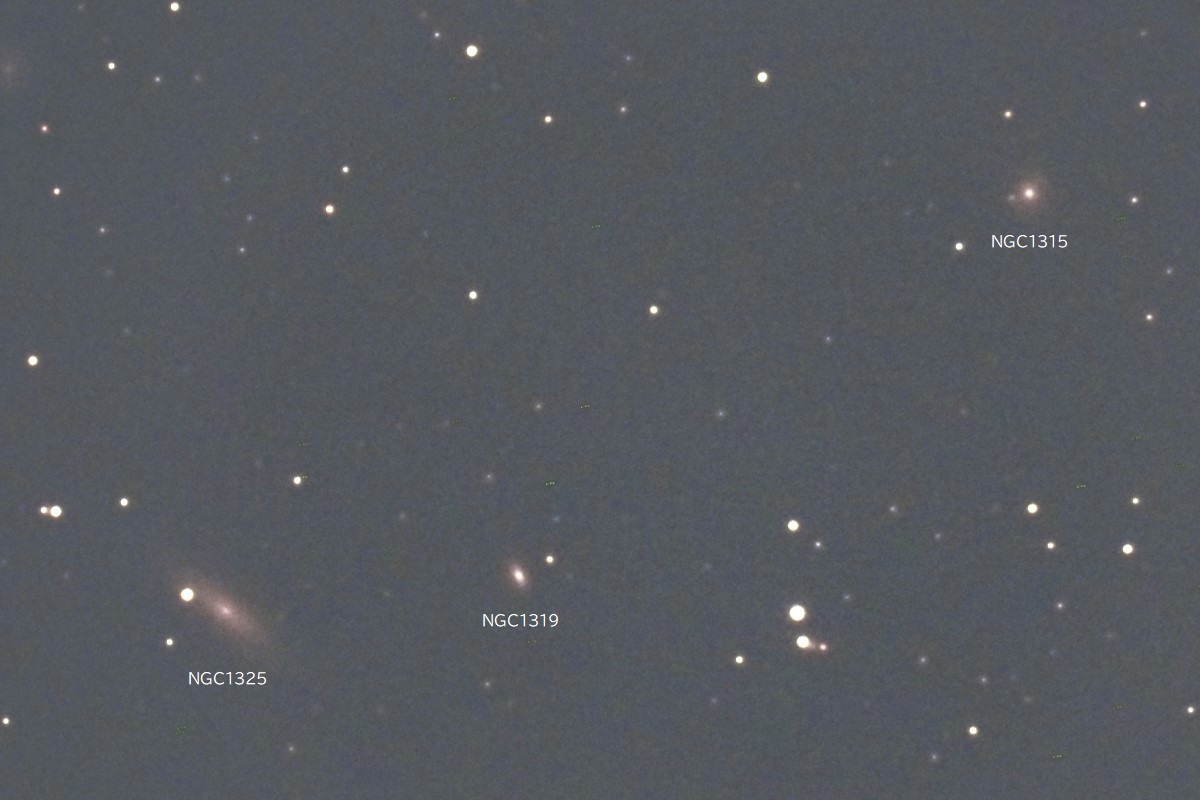 「エリダヌス座」にはτ星(タウ)がτ1~τ9まで9個ありますが、その中のτ4とτ5の中間より少しτ4寄りに位置する銀河群です。 文字入れした他にも幾つかの微光銀河の光斑が見えています。 明るさとタイプは、NGC1325_12.84等(V)_SCD、NGC1319_13.94等(B)_So、NGC1315_13.65等(B)_So-aです。