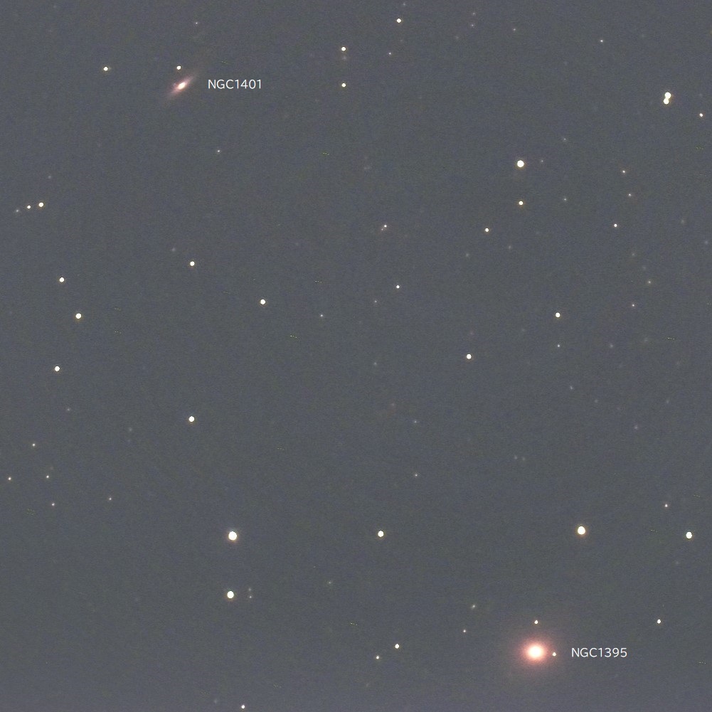 「エリダヌス座」にはτ星(タウ)がτ1~τ9まで9個ありますが、その中のτ5とτ6の中間やや南に位置する銀河2態です。 明るさとタイプは、NGC1395_9.65等(V)_E、NGC1401_12.29等(V)_Soです。
