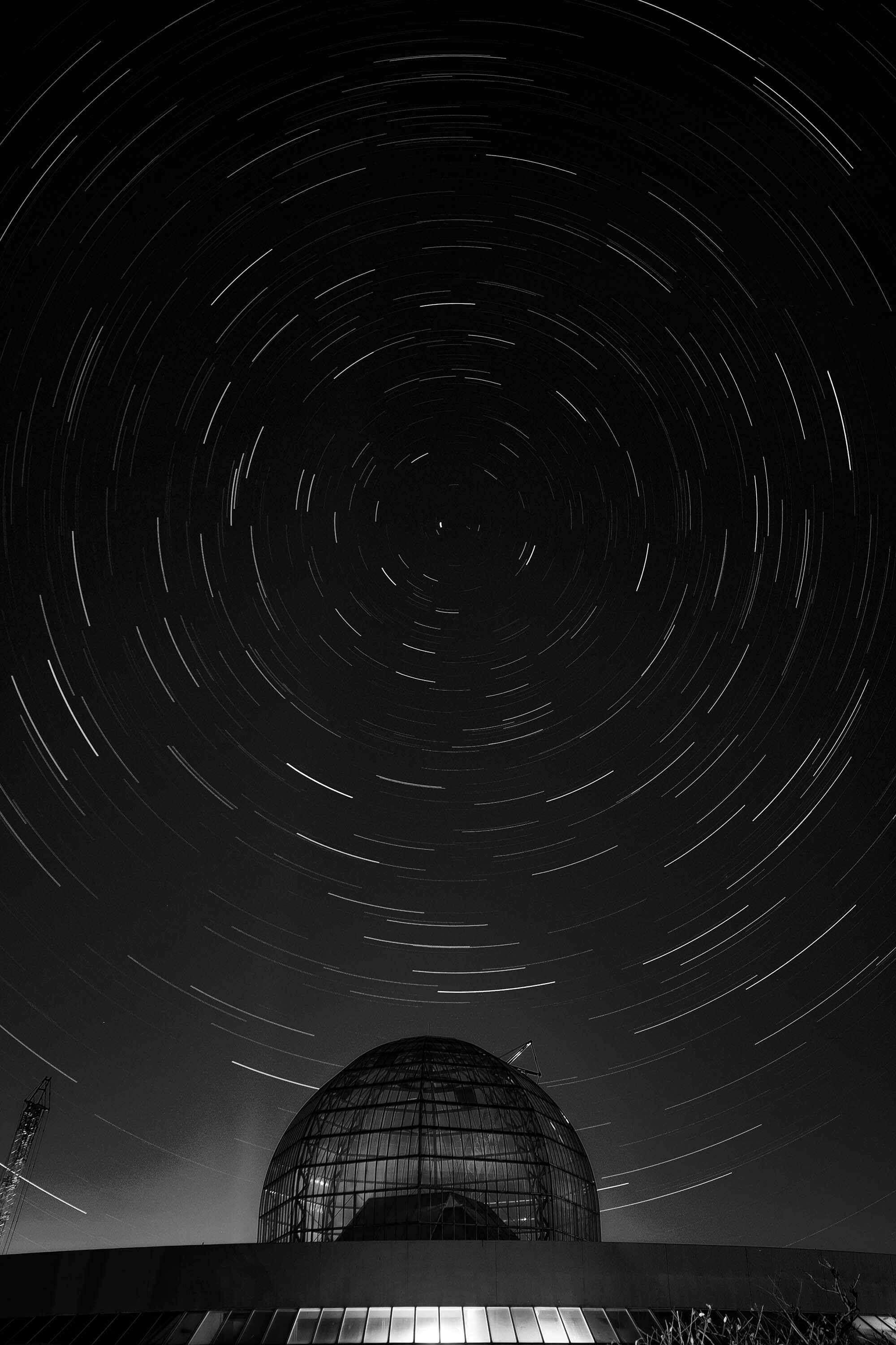 風変わりな建物と星空を撮っています。 今回は葛西臨海公園にある葛西臨海水族園の象徴的なガラスドームと。 実は年末年始の休みに一度撮りましたが気に入らず、再チャレンジ。 改修工事が始まったようで、その時は無かったクレーンが2機 入ってしまいました。 ドームにもっと近付きたかったのですが、夜間はこれが限界。 モノクロにしました。
