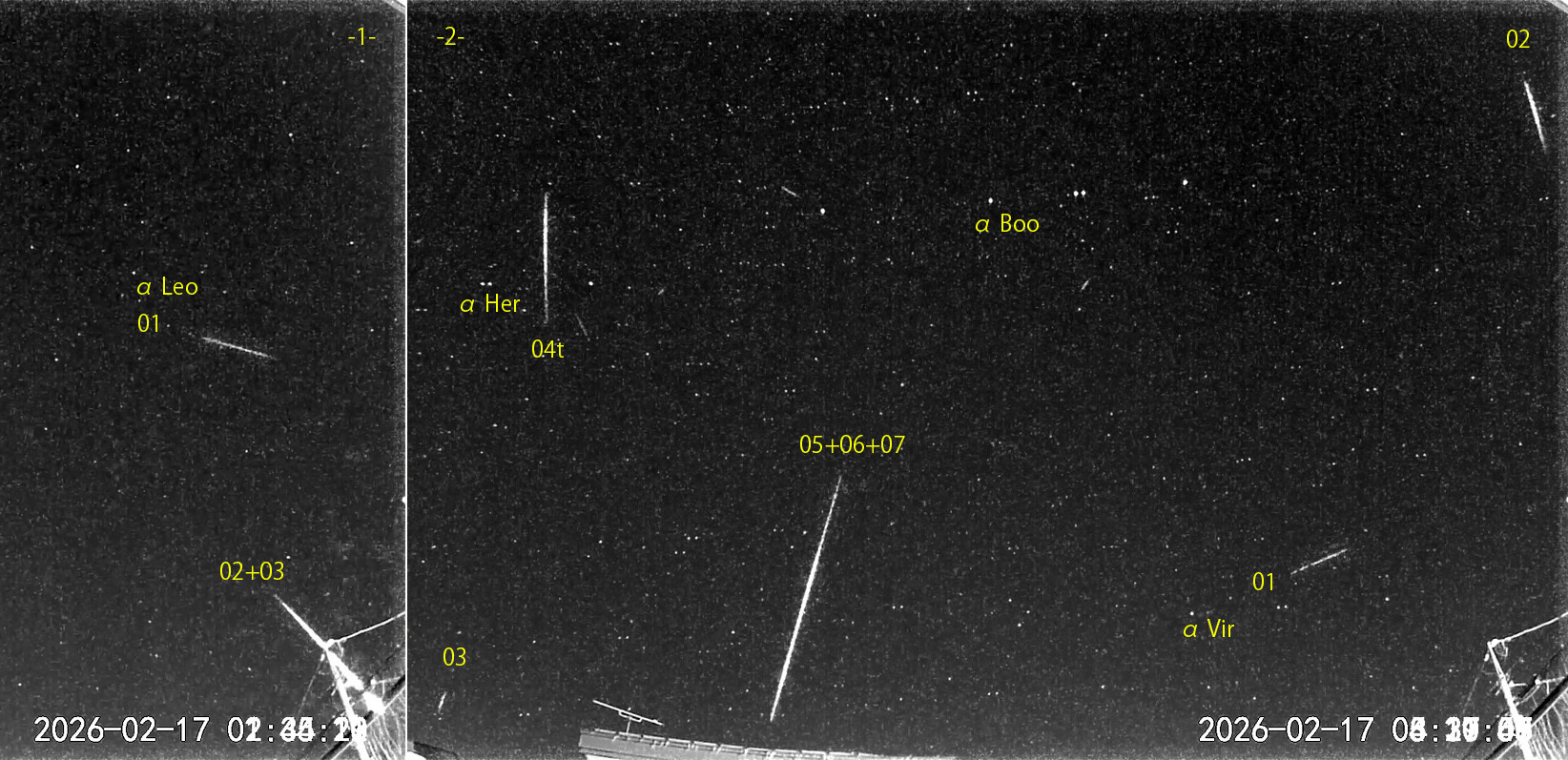 1) 01:34から約1.5時間の3コマを、2) 03:21から約2時間の7コマを処理しました。夕方から快晴で、朝の最低気温はマイナス10℃。 出現した順に数字と記号を始点付近に記入。tは痕traceあり。 -1-の02+03流星は最後に爆発しました(電線にかぶる)。