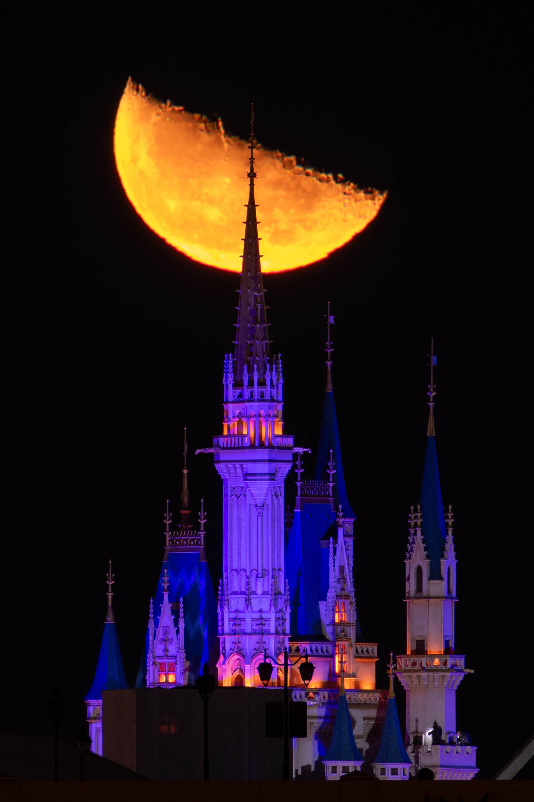 いつも撮っている写真ですが。 時刻によって、シンデレラ城のライトアップの有無、その手前の駐車場照明の有無でイメージが変わります。 今回は、後者が消えて理想の条件でした。 これは月がシンデレラ城の上に来るのを待って撮りました。