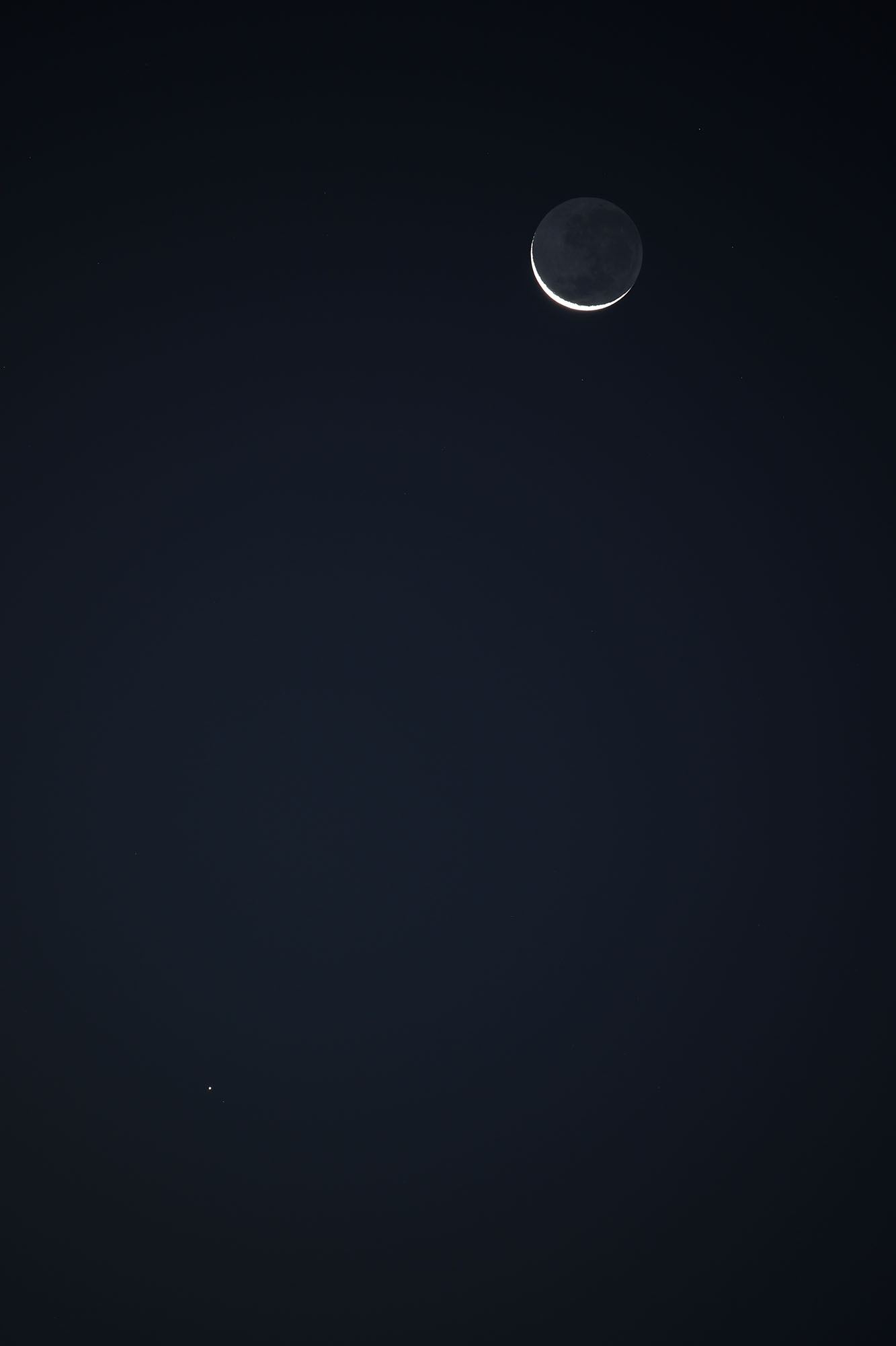 「月と水星の接近」を撮影しました。 霞が掛かった様な空でしたが低空に雲が無かったので狙ってみました。 水星もすぐに見つかりました。 画面下部を地面に平行にして撮影しています。