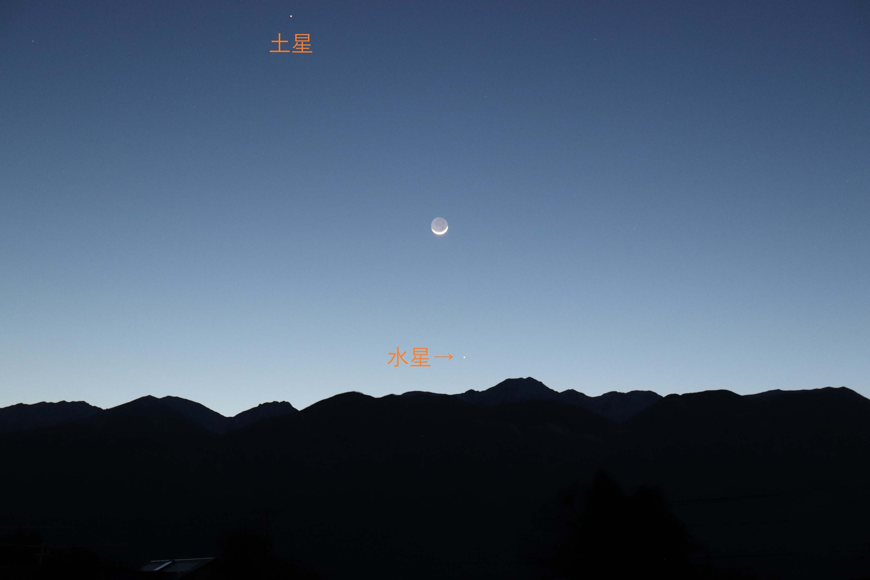 中央アルプス駒ヶ岳に沈み行く水星(+0.4等) : 細い月の左上は土星(+1.2等)です。 土星の方が明るく写っています。 水星は眼視でもハッキリ見えました。