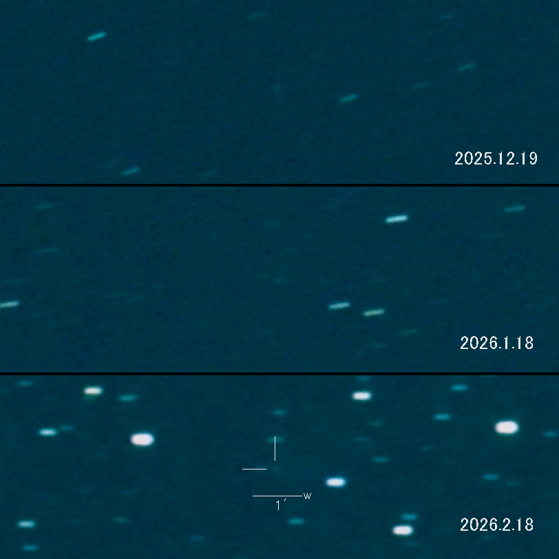 2025.12.19 → 17等級前半 2026.1.18 → 17等級前半 2026.2.18 → 16等級後半 2025年11月11日が近日点で 2026年1月頃が明るさのピークという予想でした。 1月下旬にバーストが発生して15等級になりました。 その影響で明るさを維持しています。