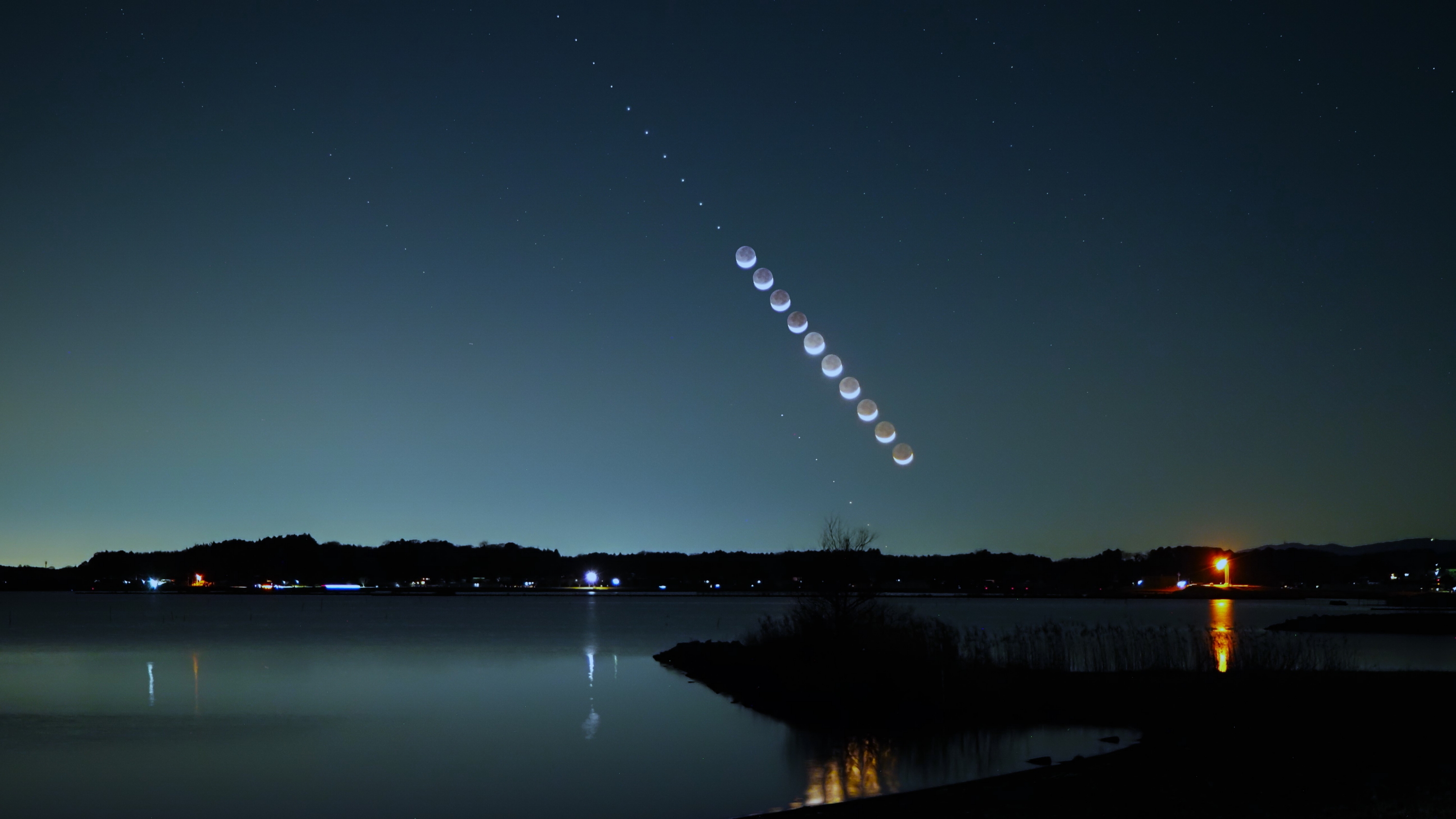 夕暮れの月と3惑星