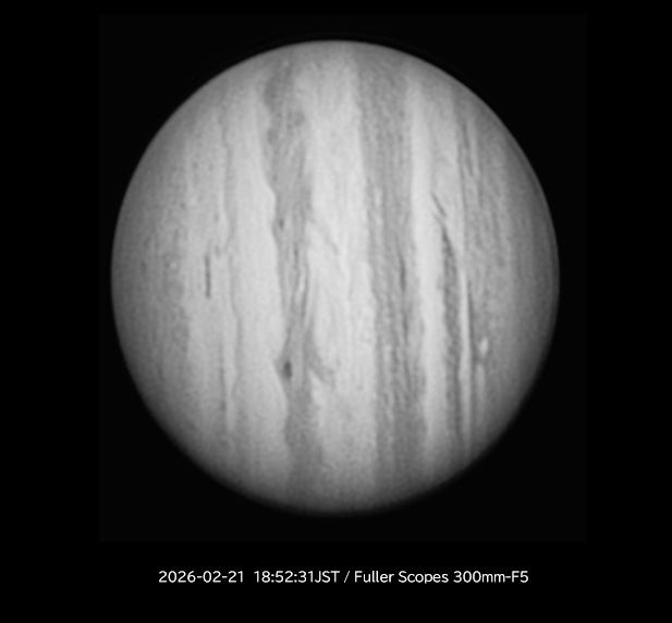 好シーイングに恵まれ、FullerScopes社製の古いφ300mm/F5カセグレン用主鏡の性能確認ができました。同社は1970~80年代に望遠鏡を販売していたイギリスのメーカーです。この鏡はDavidHinds製で評価が高いらしいので、昨年12月に海外オークションで購入してみました。再メッキされ大切に保管されていた様です。写りはSky-Watcherの40cmに近く評判通りです。木星のシーズンが終わったら、この鏡筒にφ230mmのERFを取付け太陽を撮影する予定。最近の太陽は殺風景ですね。