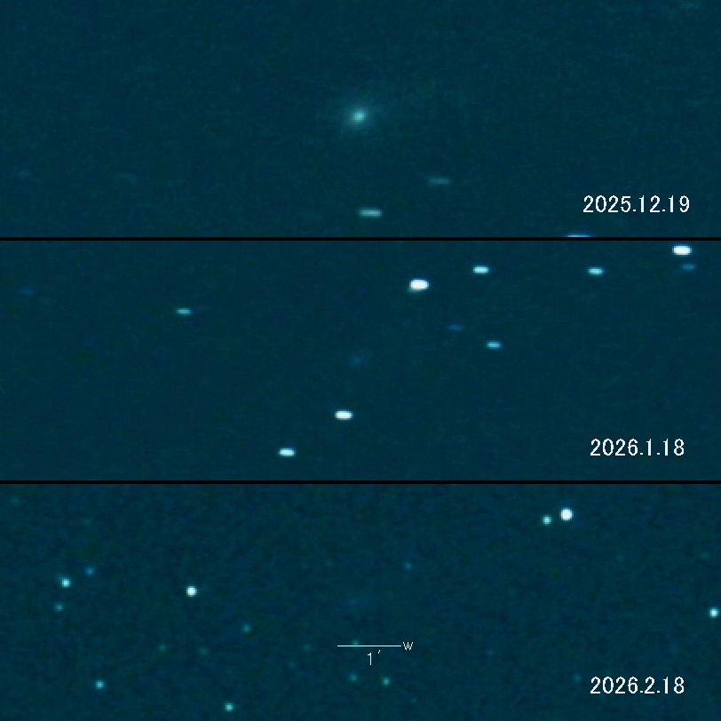 2025.12.19 → 12等級前半 2026.1.18 → 14等級後半 2026.2.18 → 16等級前半 2025年11月22日が近日点でした。 その頃明け方の東天低空で10等級になり 現在は減光中です。