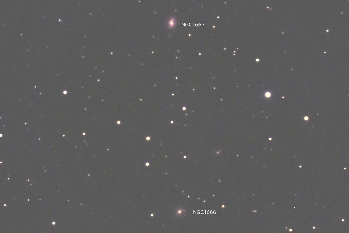 「エリダヌス座」ω星(オメガ)の南西1.4度付近に位置する銀河2態です。 明るさとタイプは、NGC1667_12.15等(V)_SABc、NGC1666_12.70等(V)_So-a