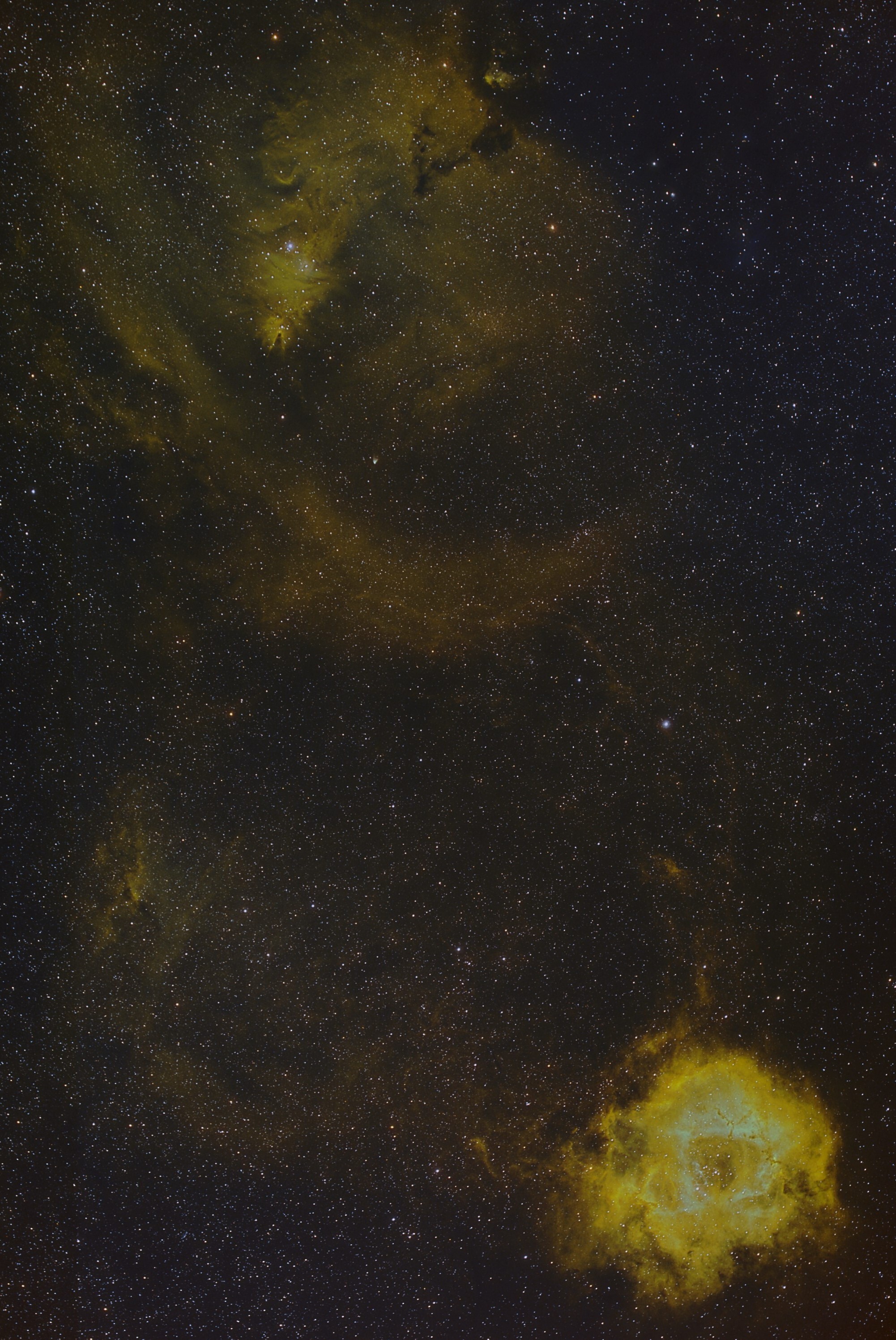 2月9日から複数日にわたりS2、Hα、O3を撮影。光害地では淡い星雲はナローバンドに頼るしかなく、時間がかかります。SAO合成画像とAOO合成画像をコンポジットしてSAOAOO画像にしたら、黄金のバラ星雲になりました。長時間露光ということもあり、光害地でもバラ星雲とクリスマスツリー星団の間の超新星残骸が見えてきました。