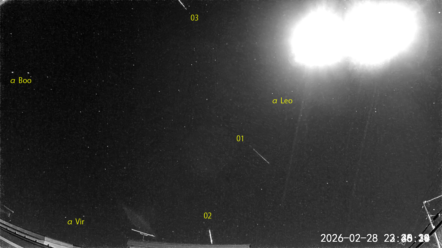 123:30から約0.5時間の3コマを処理しました。快晴ながら10m/s近い強風でした。 出現した順に数字と記号を始点付近に記入。tは痕traceあり。 流星01は、活動末期のしし座δ群と思われます。