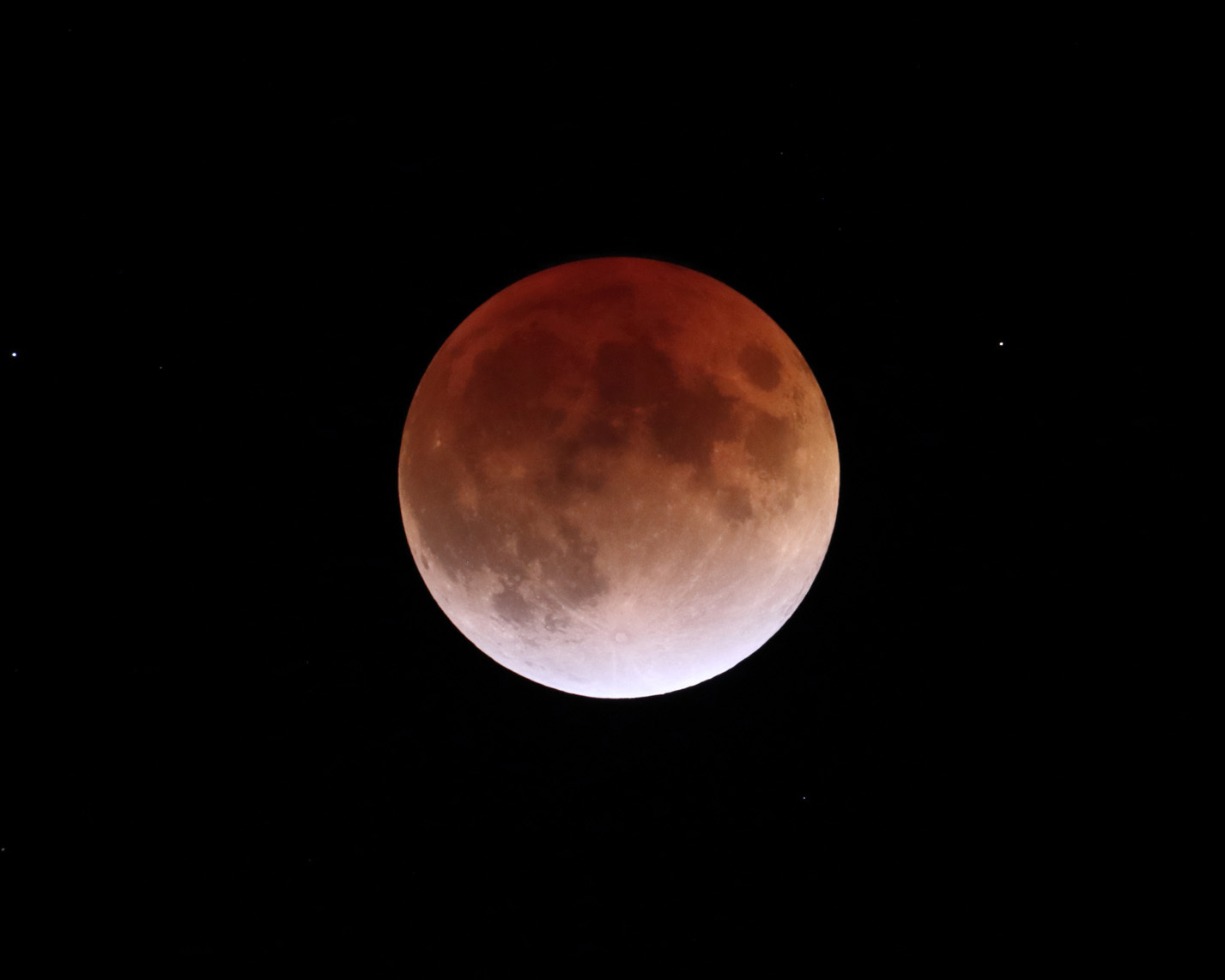 夕方はドン曇りだったので、見えないものとあきらめていました。20時30分頃ふと空をみると所々に雲はあるものの晴れて澄んだ空に綺麗な赤い皆既の月がみえています。あわてて撮影準備をして撮りましたが、すでに皆既の後半になっていました。油断大敵でした! 気が付いてからは綺麗に見えて幸運でした。