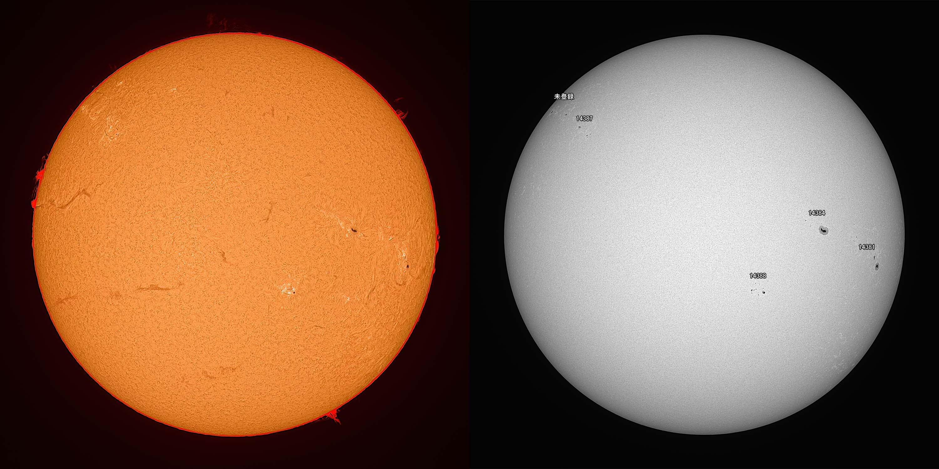 光球面:FireCapture、ROI 3600x2400、Gain 100、1.8msec x1000、撮影時間 31秒/プロミネンス:FireCapture、ROI 3600x2400、Gain 300、1.8msec x1000、撮影時間 31秒