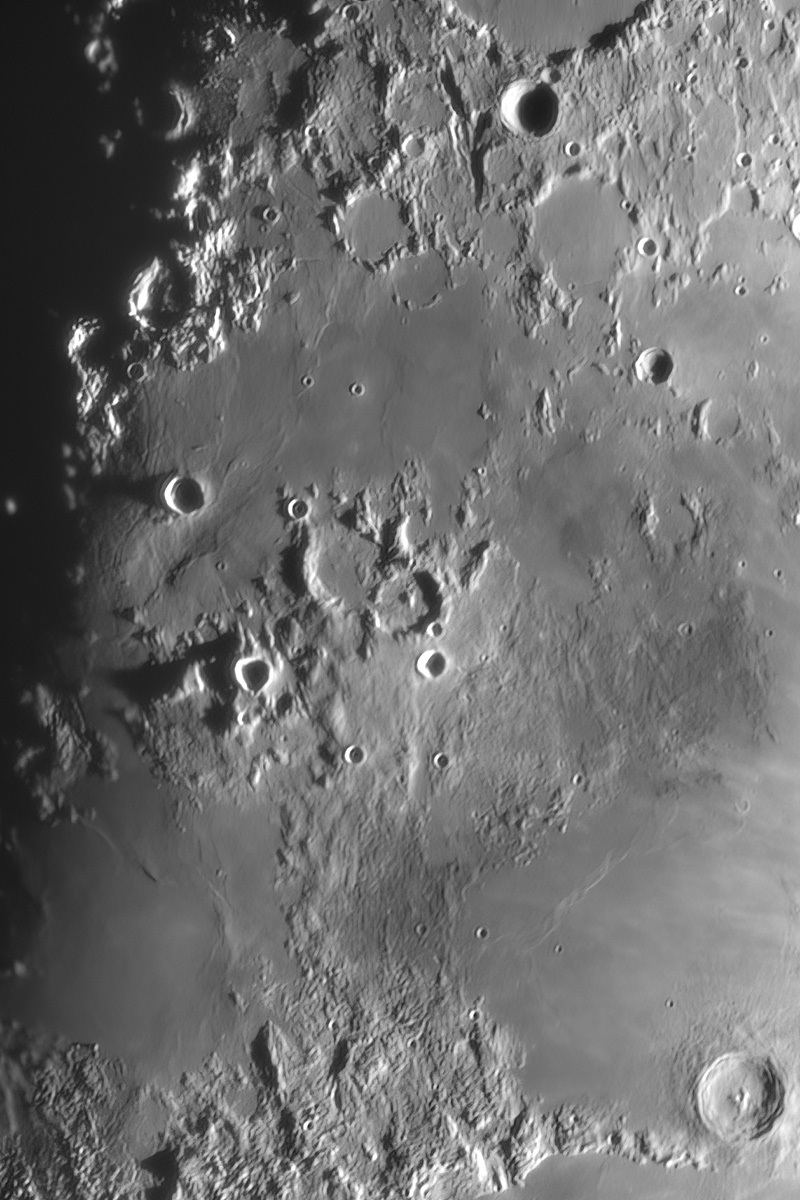 中央の入江は文字通り月面経緯度の中心がある地域で、画像上方1/4の中央あたりがその中心点です。この一帯はトリスネッカー周辺の谷など、光線状態によっては興味深い対象が散在しています。