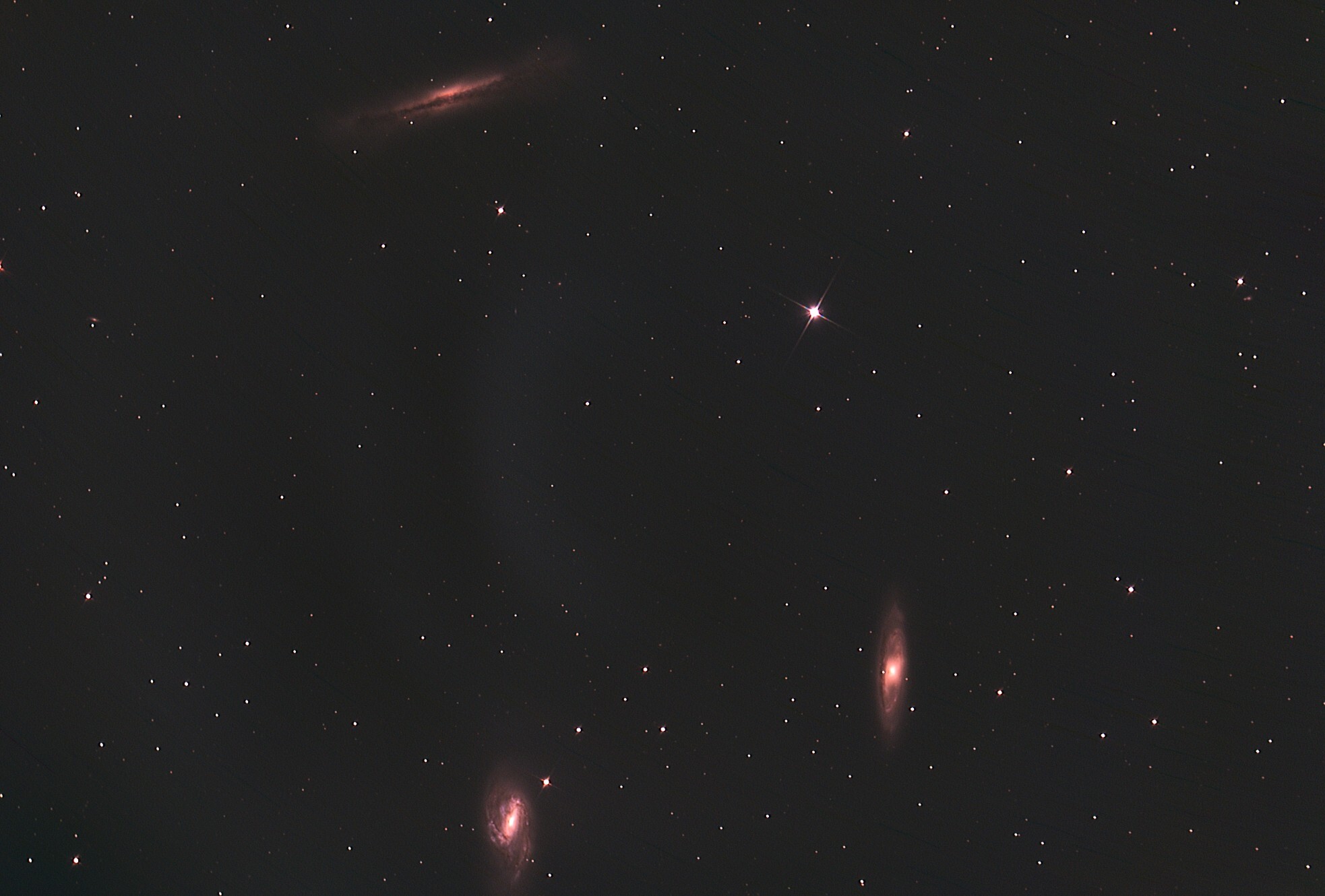 SE200NCR SV405CC ノーフィルター gain350 -20℃に冷却 30秒×274=2時間17分 PHD2でオートガイド DSSでスタック。Sirilで色調補正、レベル補正。 近赤外撮影のモノクロは寂しかったので、赤外まですべて使用してカラーCMOSカメラのノーフィルターで撮影してみました。赤みが強いですが、何とかカラーで仕上げられました。約3500万光年離れた位置にある小さな銀河群と言われています。