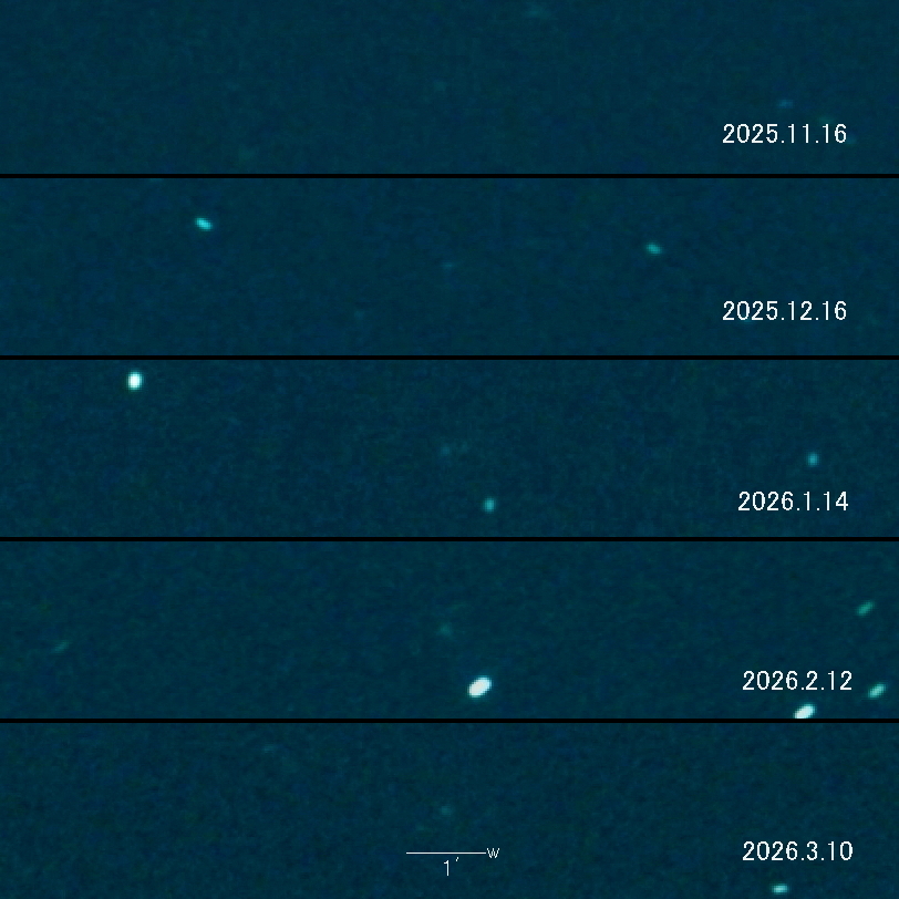 2025.11.15 → 17等級後半 2025.12.16 → 17等級前半 2026.1.14 → 16等級前半 2026.2.12 → 15等級後半 2026.3.10 → 15等級後半 2025年5月27日が近日点でした。 地球との位置関係により2026年春が明るさのピークという予想です。