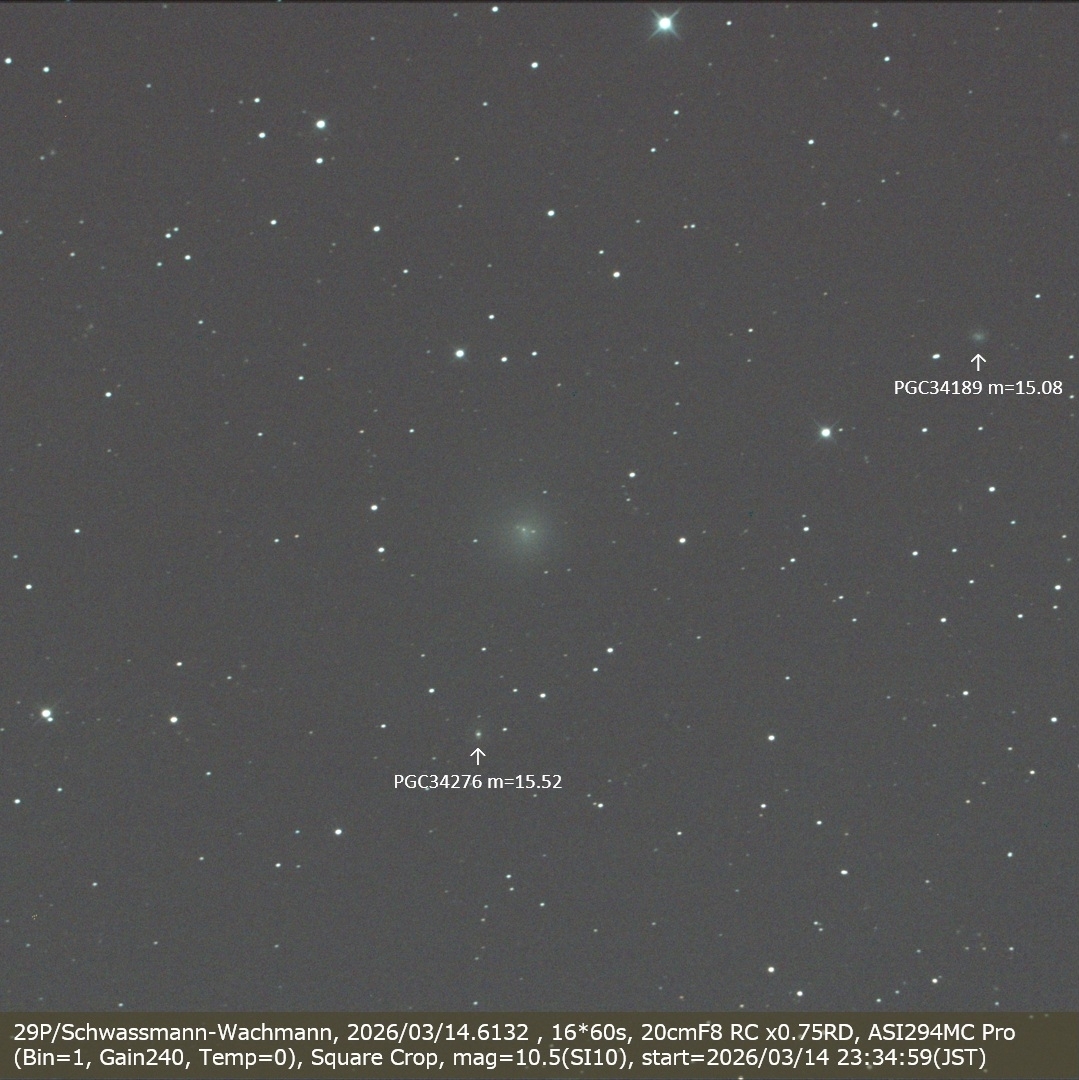 29P/Schwassmann-Wachmann, 2026/03/14.6132 , 16*60s, 20cmF8 RC x0.75RD, ASI294MC Pro (Bin=1, Gain240, Temp=0), Square Crop, mag=10.5(SI10)