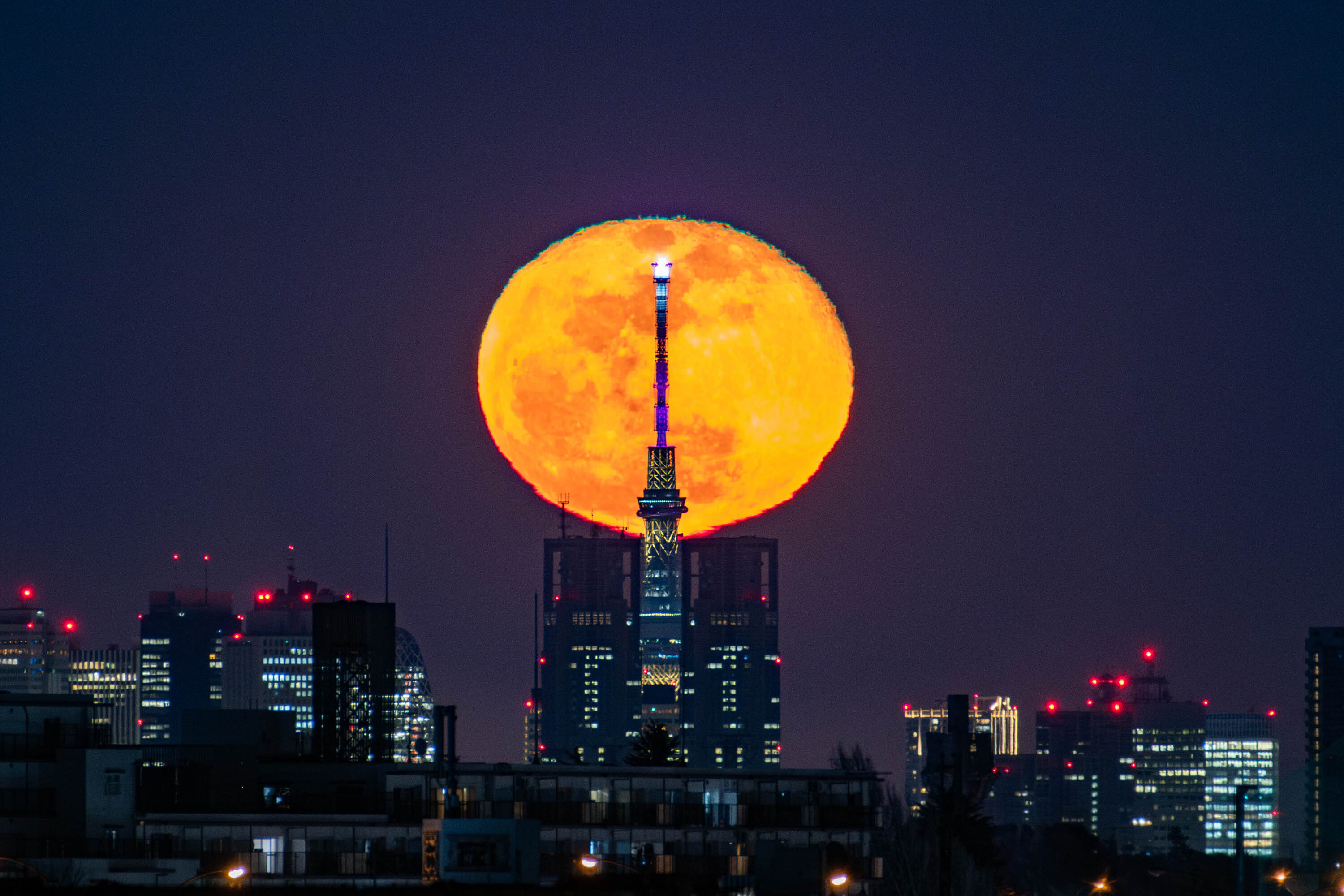 佐藤 純哉東京スカイツリーと東京都庁がぴったり重なって見える所から月齢15.6の月