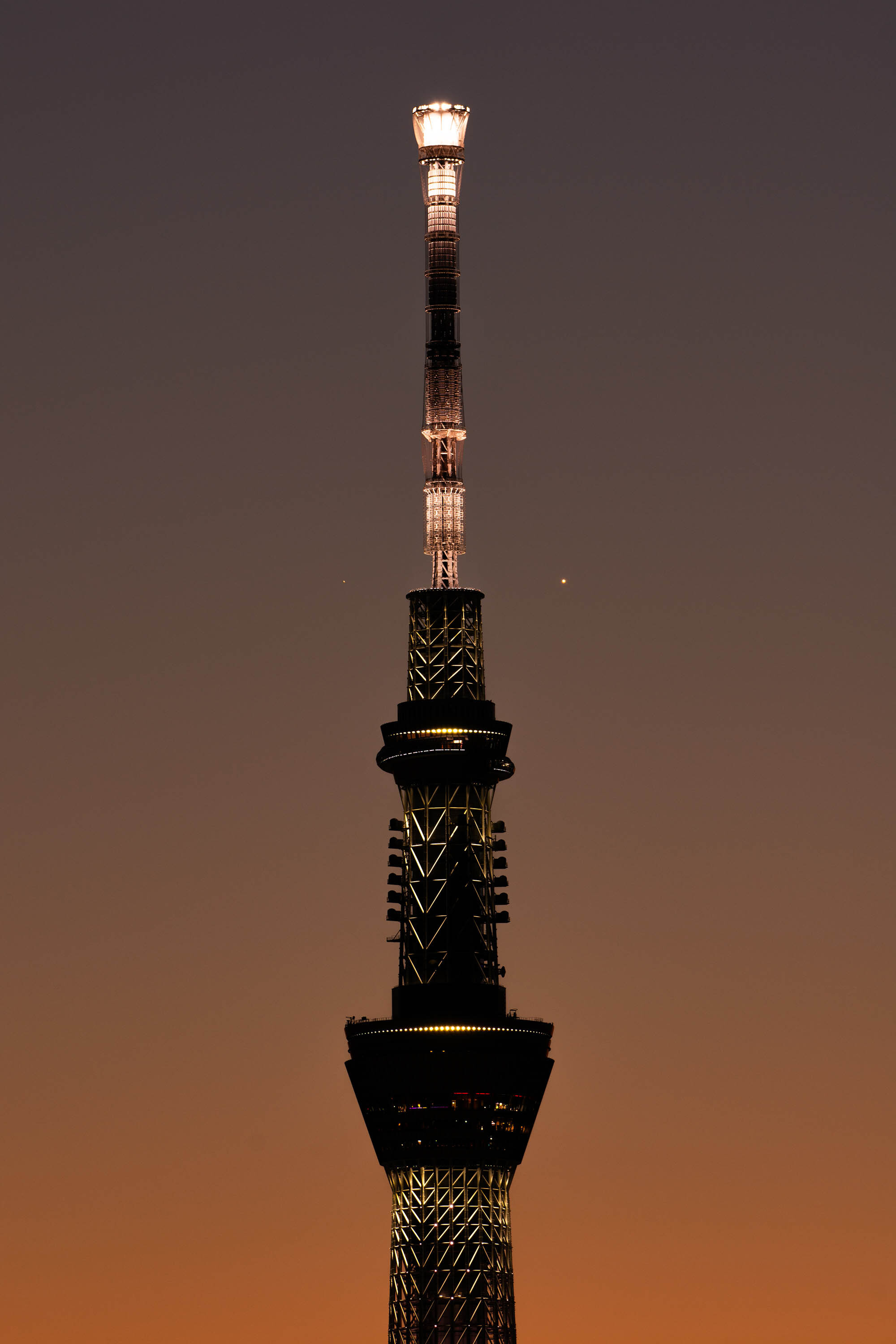 この日は快晴で、天体山望で東京スカイツリーと撮影出来る位置を調べ撮りに行きました。 日没後、金星は比較的早く見つけられましたが、土星はなかなか。普段から東京で土星を見つけるのは難しいです。 二惑星がツリーの左右に入るよう、撮影位置を動きながら。 風が強く、良いタイミングでシャッターが切れない等、大変でした。 ツリーの右が金星、左が木星。