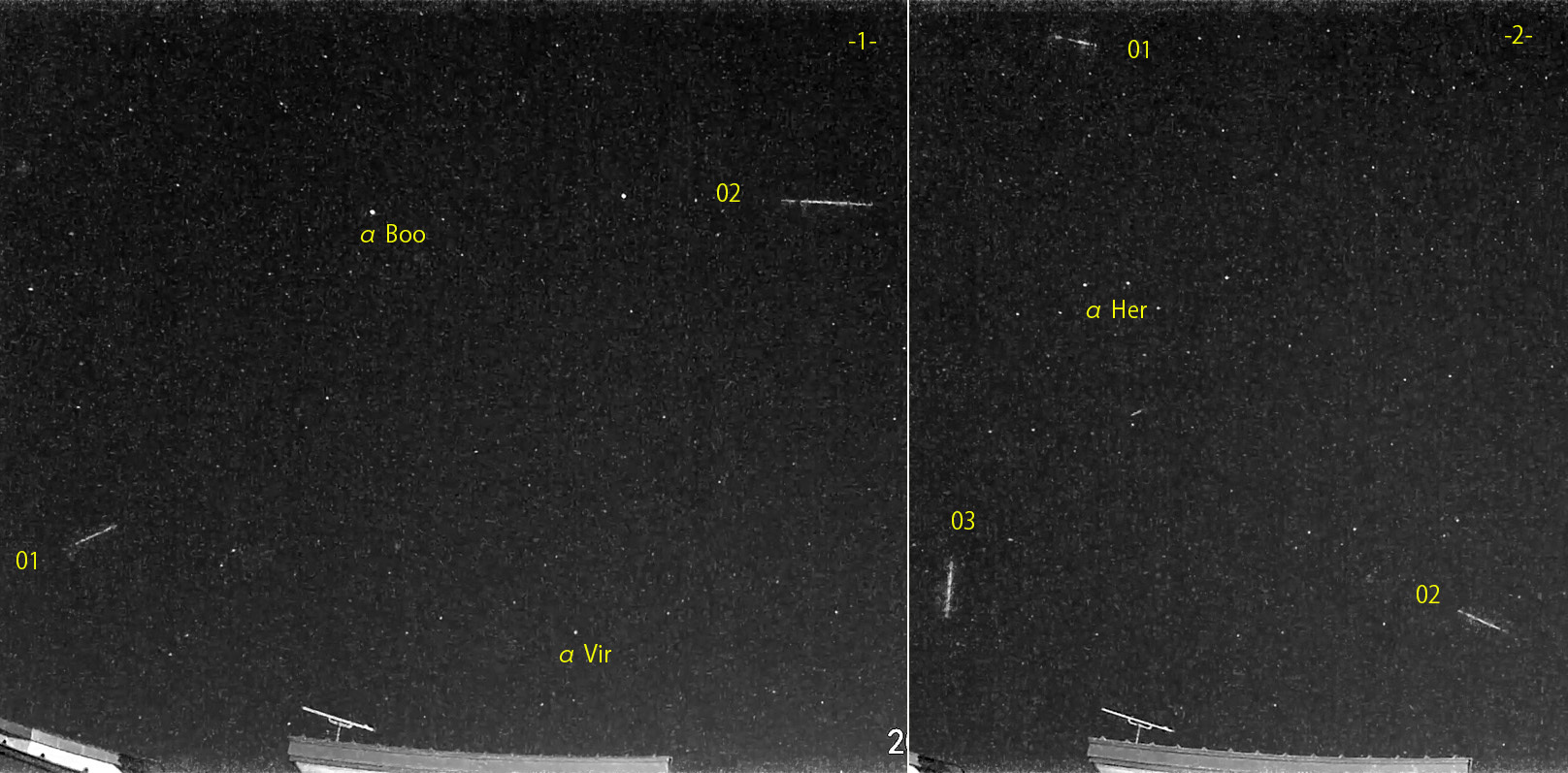 1) 00:46から約1.5時間の2コマを、2) 03:19から約1時間の3コマを処理しました。朝の最低気温マイナス3℃。 出現した順に数字と記号を始点付近に記入。tは痕traceあり。