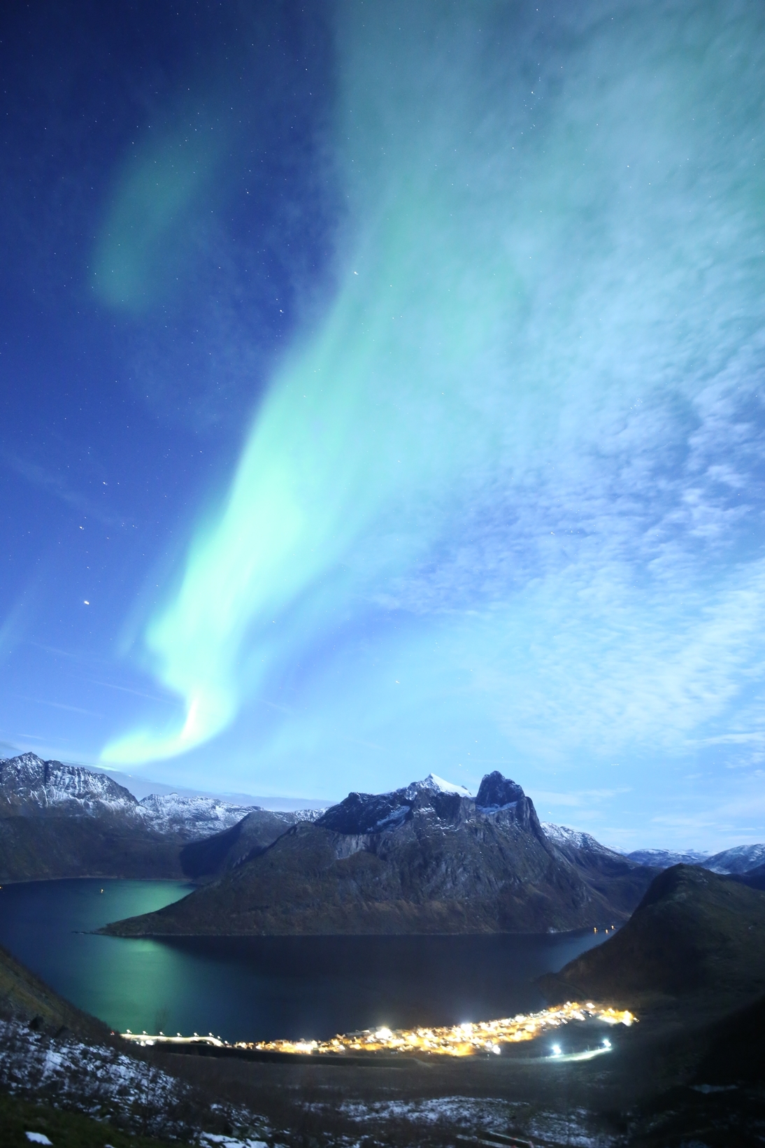 フィヨルド上のオーロラの光が強まり海面を緑に染めました。 地面には雪も見えだいぶ上まで来ました。あと少しで目的地です。 「噴煙オーロラの山」が同じ山とは思えない姿で待ち受けていました。 中央左端に木星とふたご座のポルックス、カストル。