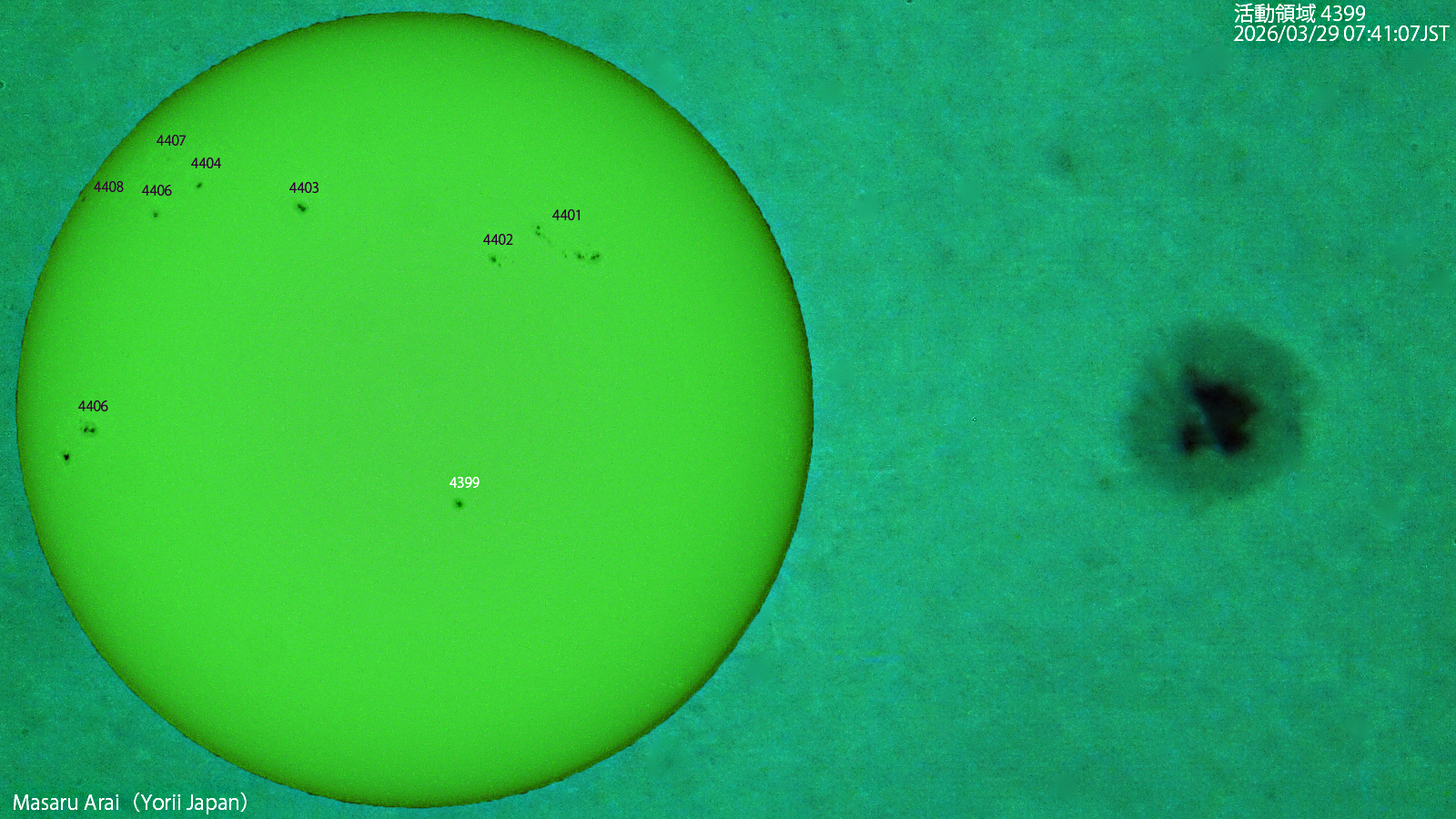 SE120L+DMC-GH1よる 4399 ( Hsx/Cso ) です。 NICT情報:活動領域4405などでCクラスフレアが数回発生し、最大のものは、活動領域4407で31日9時6分JSTに発生したC1.5フレアでした。