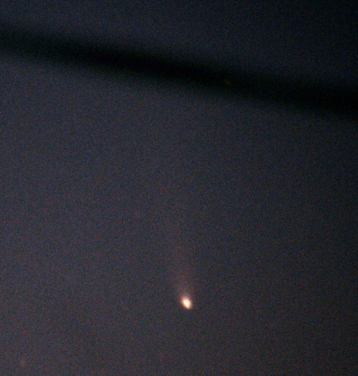 非常に低空で、彗星を見つけるのが大変でした。ひどいピンボケで追尾ずれもありますが、画像処理したらなんとか彗星らしい姿に仕上がりました。コマも尾も夕焼けに染まっています。