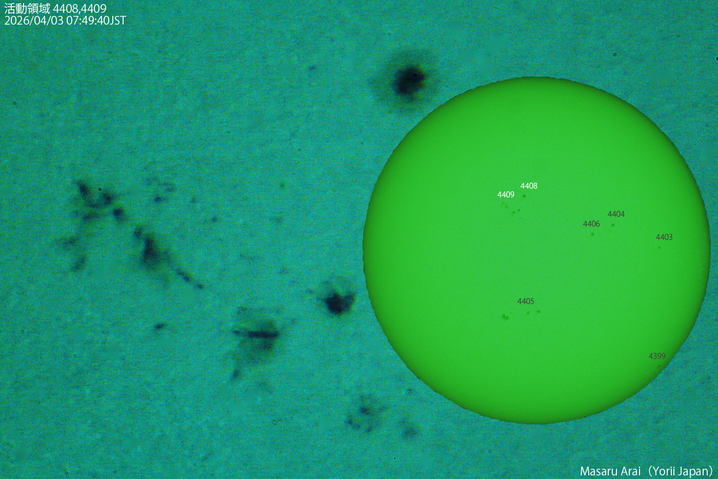 SE120L+DMC-GH1よる 4408 ( Hsx/Hsx ) 、4409 ( Dai/Dri ) です。 NICT情報:活動領域4404で、3日3時15分JSTにM3.5/2Bフレアが発生しました。