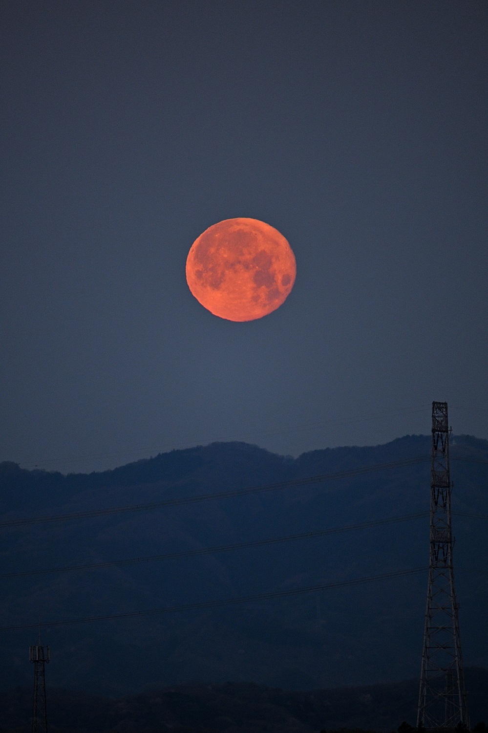 沈むピンクムーンをロクヨンで捉えた画像になります。 春霞由来でピンクムーンの名前どおりサーモンピンクの月面で心揺さぶる1枚に仕上がったように思います・・・。