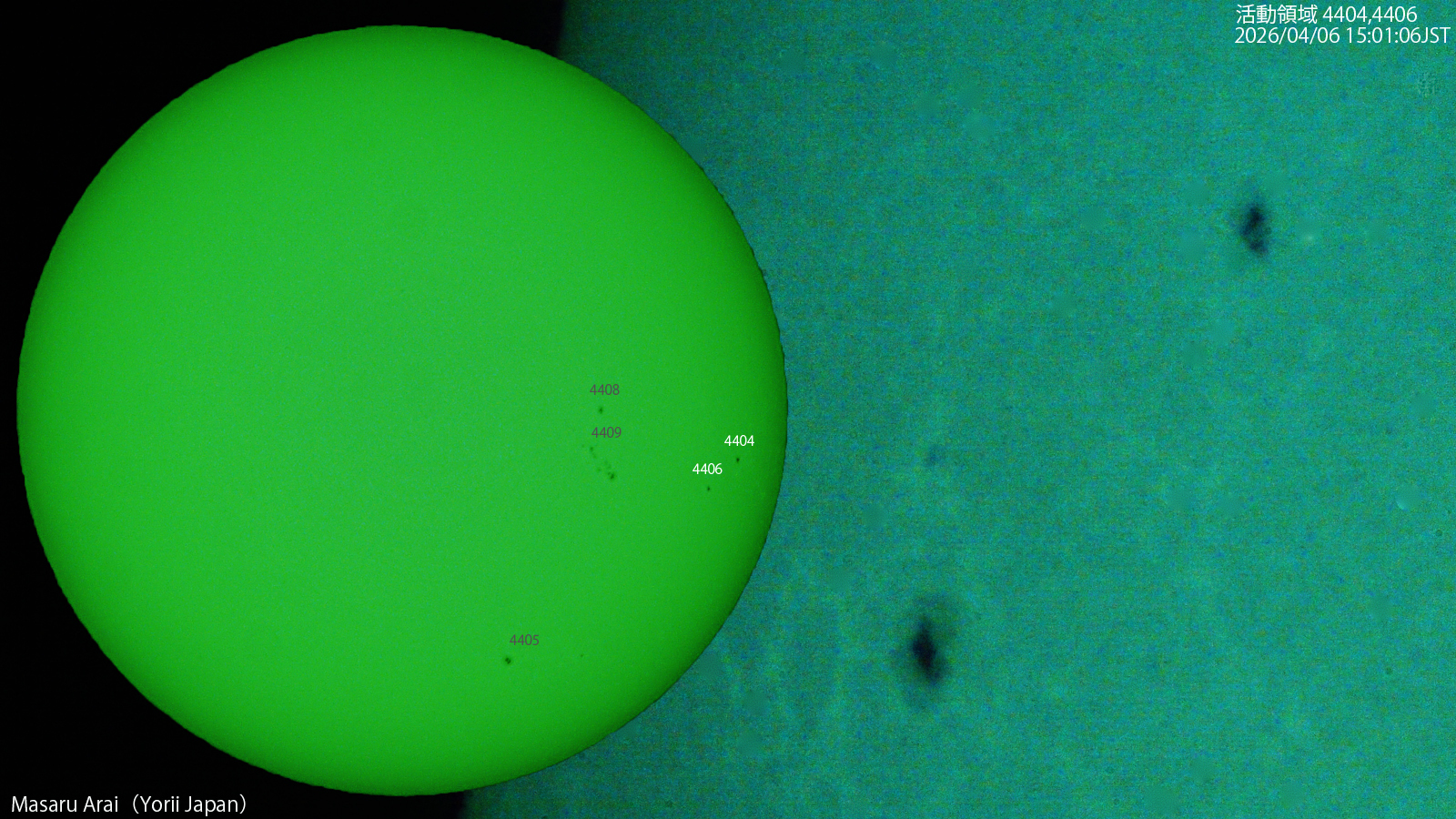 SE120L+DMC-GH1よる 4404 ( Hsx/Hsx ) 、4406 ( Hsx/Hsx ) です。 NICT情報:活動領域4409で、6日14時15分JSTにC1.0フレアが発生しました。
