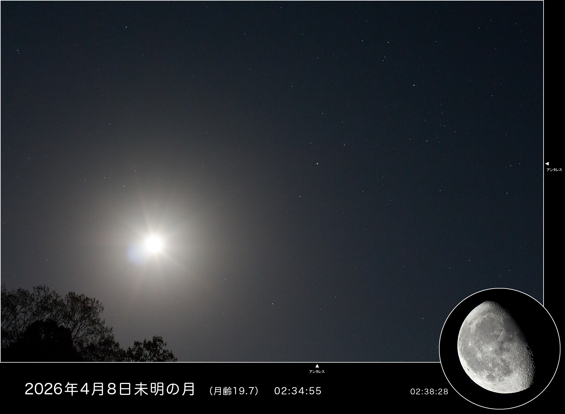上記は「月+アンタレス(星景)」の撮影データ。 画面右下円内「月」の撮影データ カメラ&三脚は同じ。 レンズ EF-S 55-250mm f/4-5.6 IS II 焦点距離 250mm ISO 100 絞り F5.6 1/80秒 AWB SILKYPIX DS9にてRAW現像。Photoshop CS5にて調整&トリミング&リサイズ。