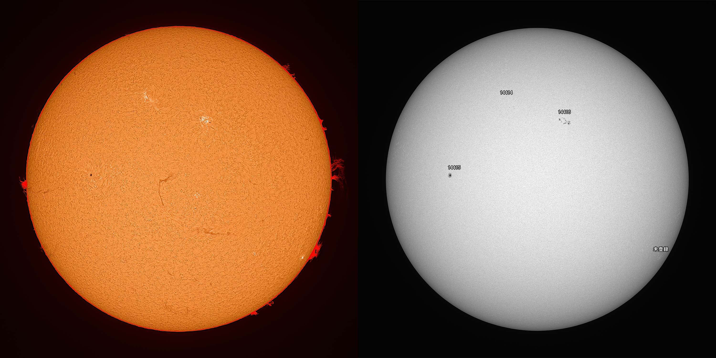光球面:FireCapture、ROI 3600x2400、Gain 100、1.65msec x1000、撮影時間 31秒/プロミネンス:FireCapture、ROI 3600x2400、Gain 300、1.65msec x1000、撮影時間 31秒