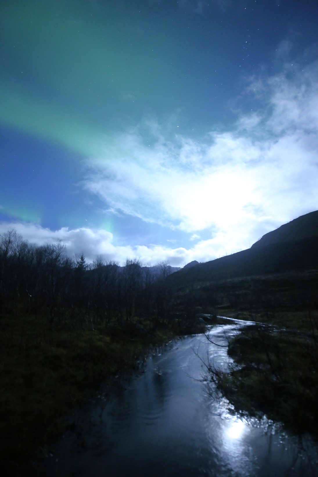 この場所は小規模ながら湿原となっています。 派手なオーロラの方はほとんど曇ってしまったものの こちらはまだ晴れ間があり小川を月が照らしていました。 この後天気もどんどん悪くなってくるのですが、最後の最後に驚愕の大サプライズを頂きました。 人生初撮影となる奇跡×奇跡のシーン!