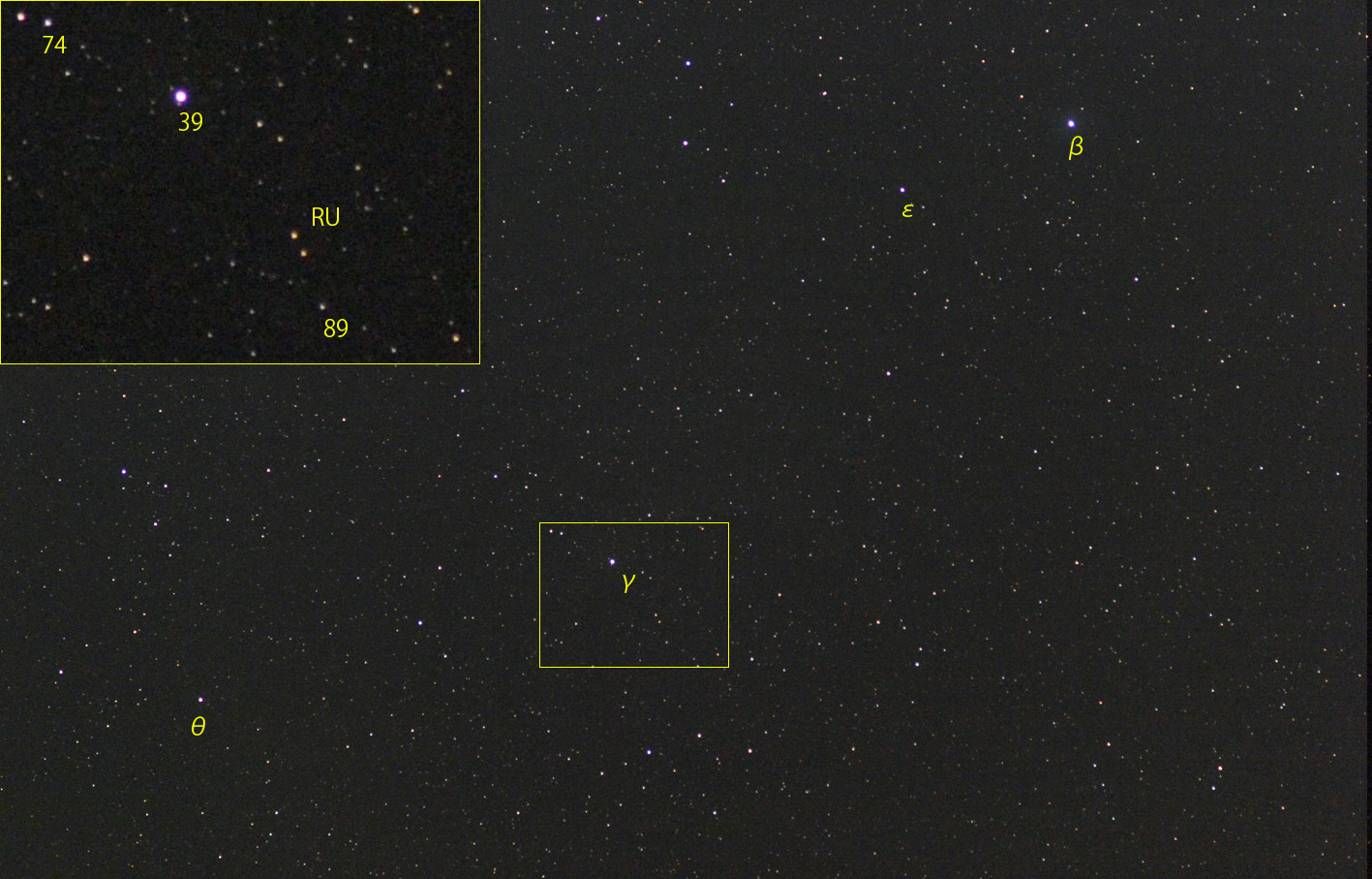 天文現象カレンダーに4月19日てんびん座RU星が極大(7.2~14.8等、周期317日)とあり、撮影。 DLしたAAVSO星図との比較では、RSは7.5等程度に見えます。色調は赤みを帯びています。 γ星の近くなので導入は容易でした。