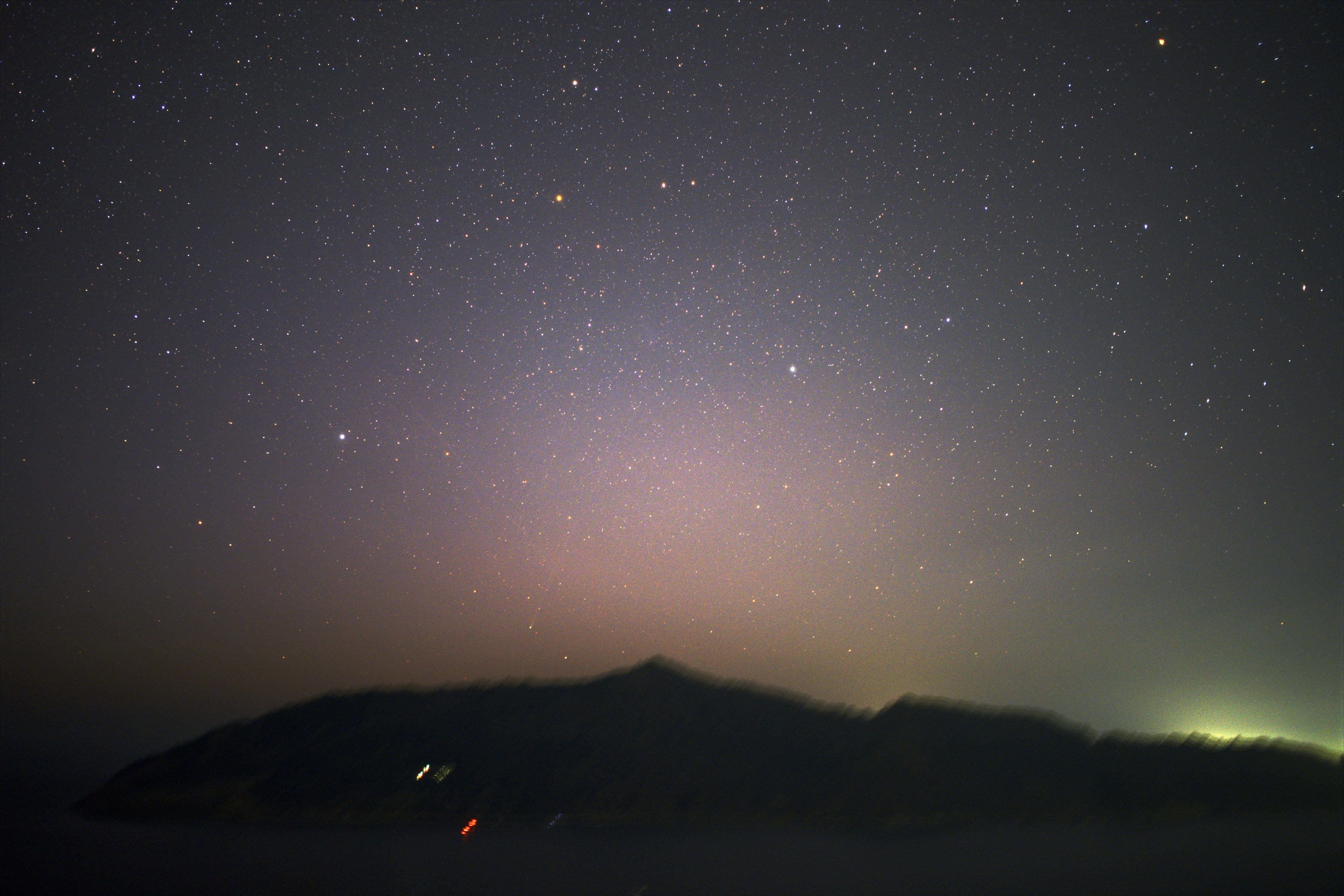 金華山の上に明け方のぼってきたパンスターズ彗星です。薄もやがあるようでしたが、広角でも小さくテイルが写りました。