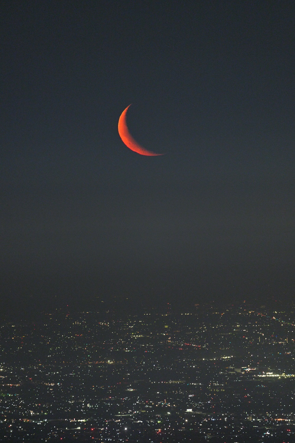 群馬県南部の夜景と紅の月(月齢25.8)の共演を600mmで捉えた画像になります。 紅に染まった細い月がアクセントになり心揺さぶる1枚に仕上がったように思います・・・。