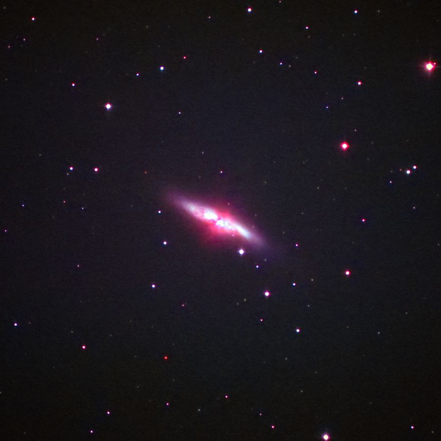 おおぐま座のスターバースト銀河 M82(NGC3034)です。極方向に伸びた赤いスーパーウィンドを意識して処理しています。(片山 徹)