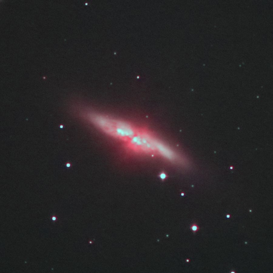 おおぐま座のスターバースト銀河 M82(NGC3034)の強拡大です。シーイングが良かったので銀河中心部にツブツブが写っています。これは超星団 (SSC:Super Star Clusters)で数十万~数百万個の星がギュッと凝縮された巨大な星の塊です。(片山 徹)