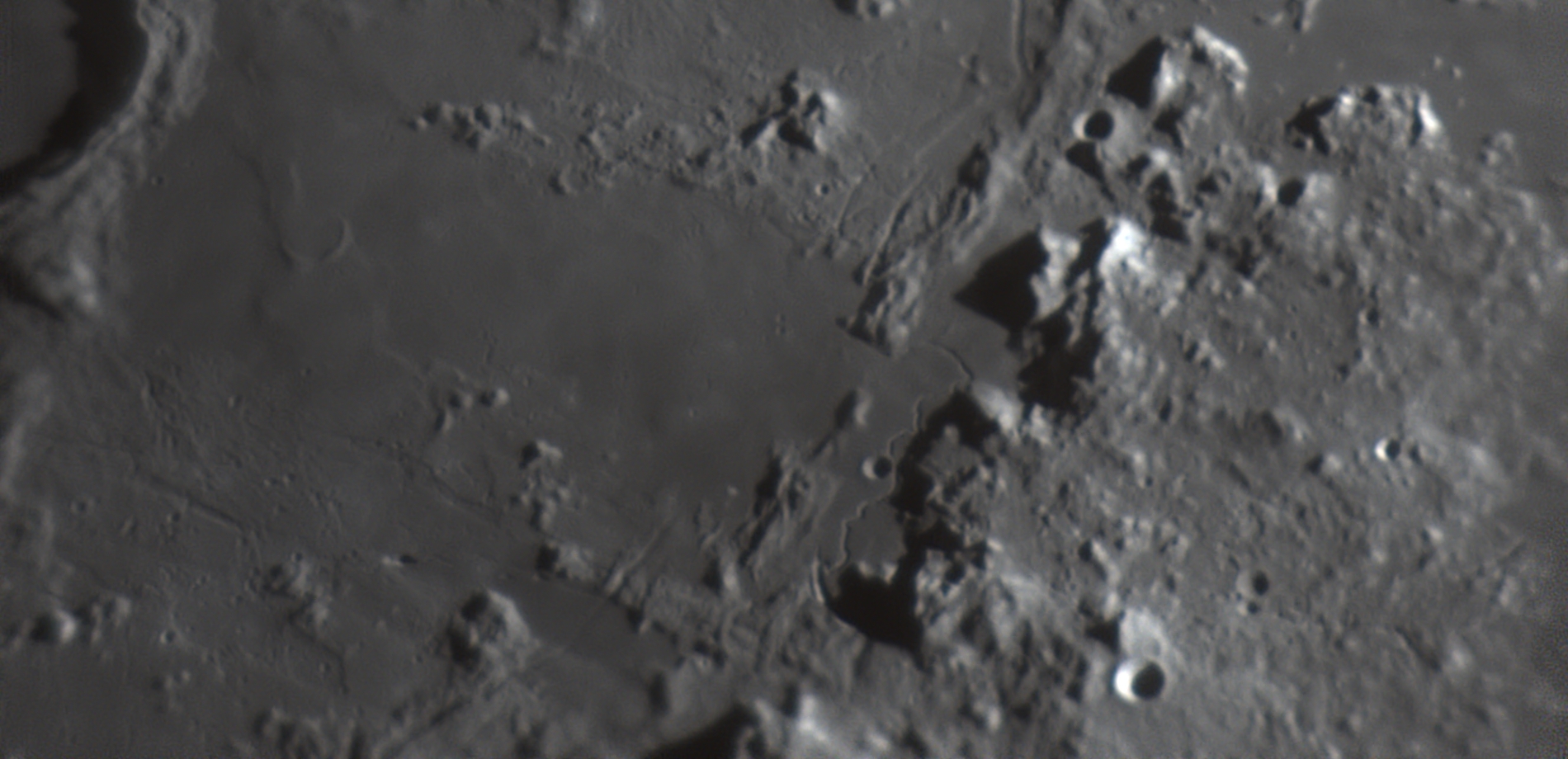 月面クローズアップシリーズ。 ハドレー谷はアポロ15号の着陸地点です。春のシーイングでまあまあの写りで左上のクレーターはアルキメデスです。