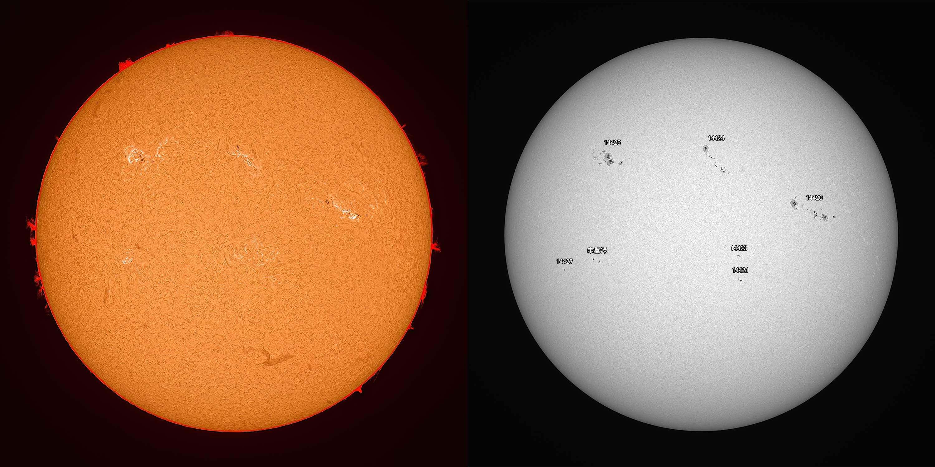 光球面:FireCapture、ROI 3600x2400、Gain 100、2.15msec x1000、撮影時間 31秒/プロミネンス:FireCapture、ROI 3600x2400、Gain 300、2.15msec x1000、撮影時間 31秒