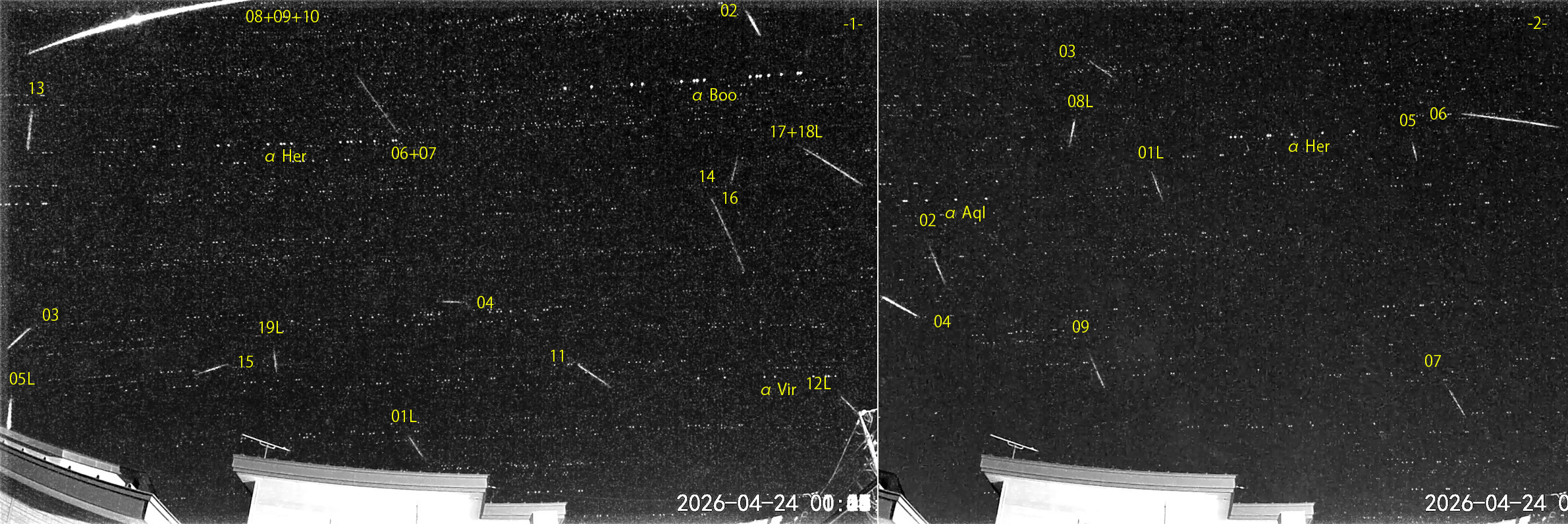 1) 00:11から約1時間の19コマを、2) 02:33から約1時間の9コマを処理しました。朝の最低気温は1℃。 出現した順に数字と記号を始点付近に記入。tは痕traceあり。流星群記号L:4月こと座流星群 流星数は多いですが、こと座群流星は前夜よりも激減です。