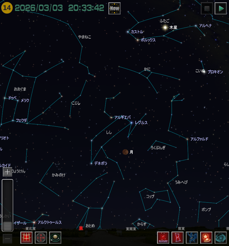 星図上部には月齢と日時が表示されています。日時の数字部分を左クリックすると数字が増加して日時が進み、右クリックすると数字が減少して日時が戻ります。