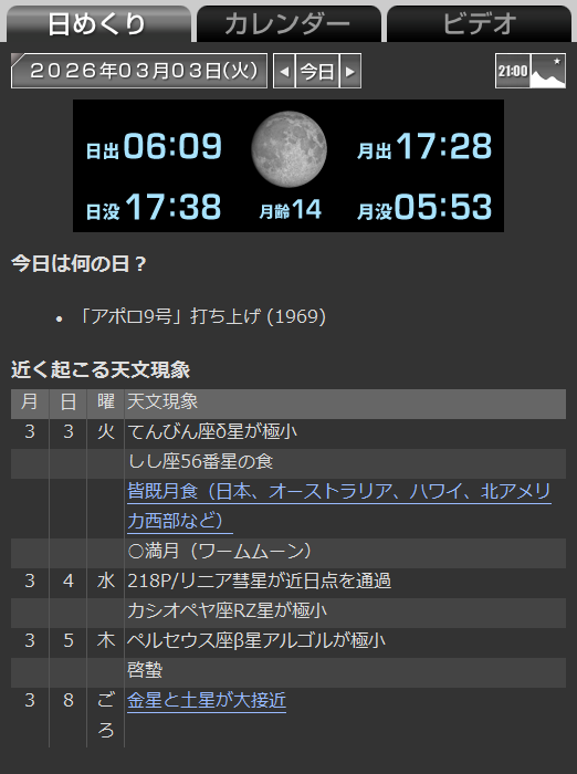毎日の太陽と月の出没時刻、月齢、過去同日にあった天文関連イベント、近日中に起こる天文現象を表示します。天文現象のリンクをクリックすると、解説とシミュレーションのページを表示します。