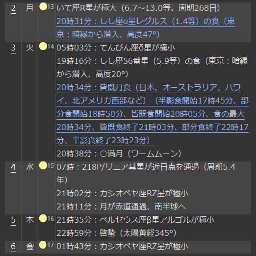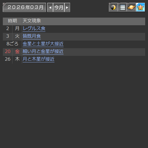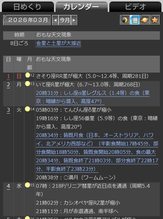毎日の月齢と主な天文現象を1か月単位で表示します。日付の部分をクリックすると、その日付の日めくりカレンダーのページを表示します。また、天文現象のリンクをクリックすると、解説とシミュレーションのページを表示します。